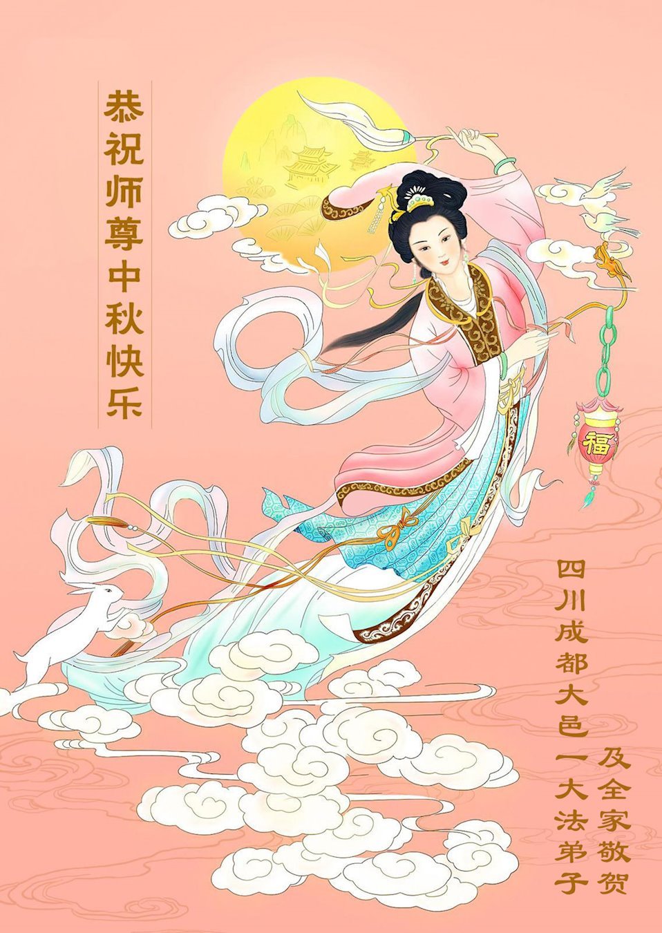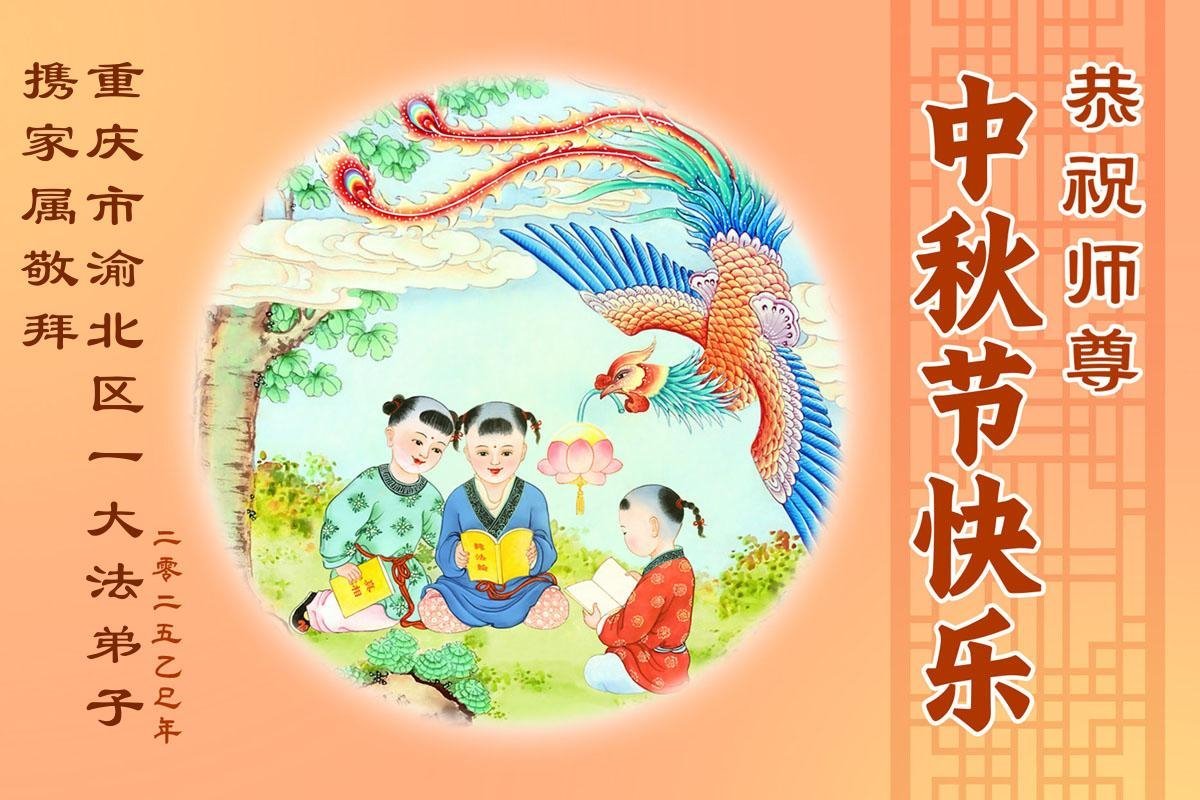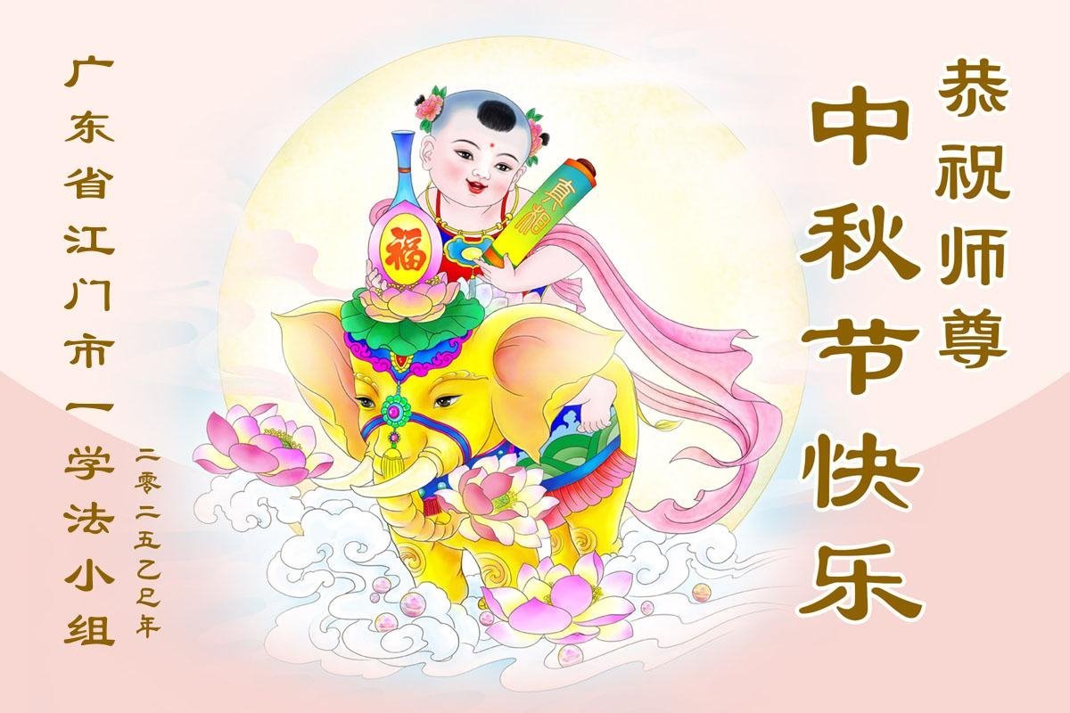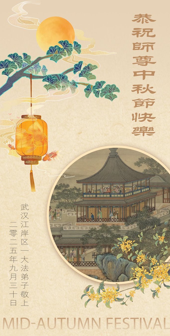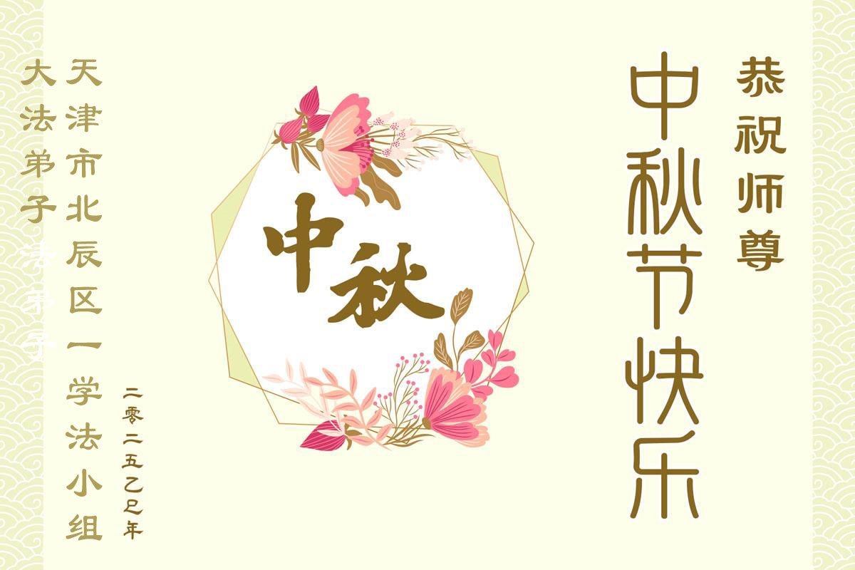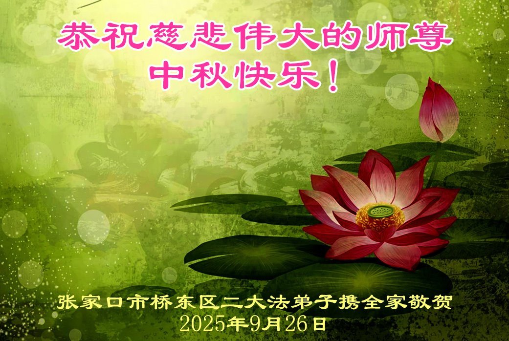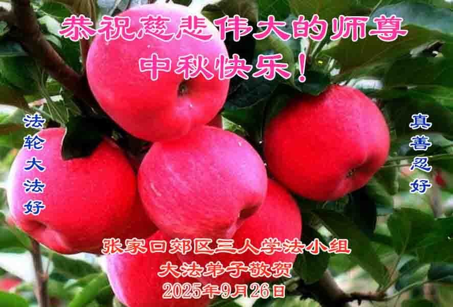 我們大法弟子攜家人和明真相的世人恭祝師尊中秋節快樂!師尊辛苦了!謝謝師尊的慈悲苦度!弟子一定破除舊勢力的安排,消除間隔,形成強大的整體,反迫害,救度眾生。弟子們要多學法,學好法,發好正念,向內找,兌現自己的誓約,跟師父回家。
