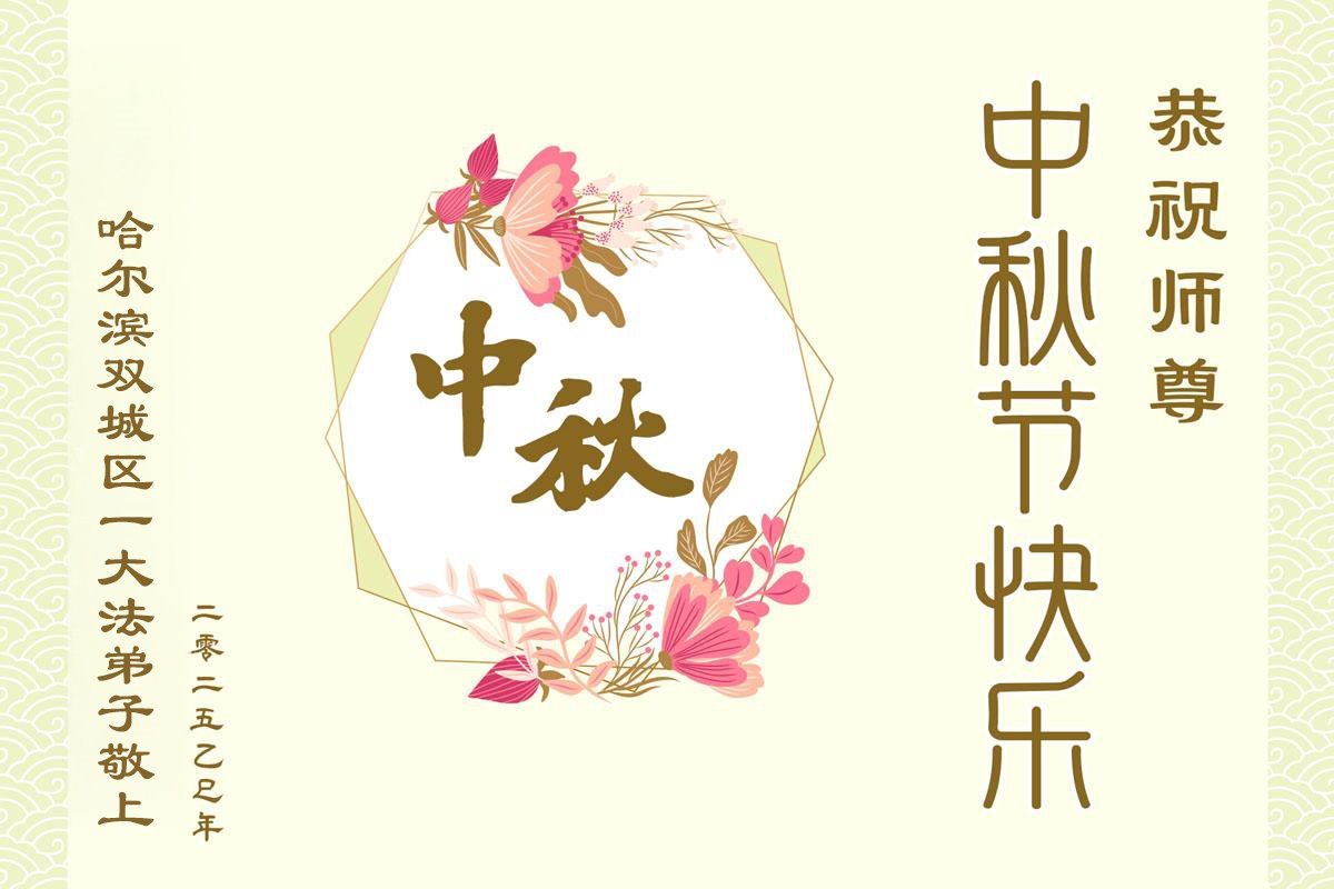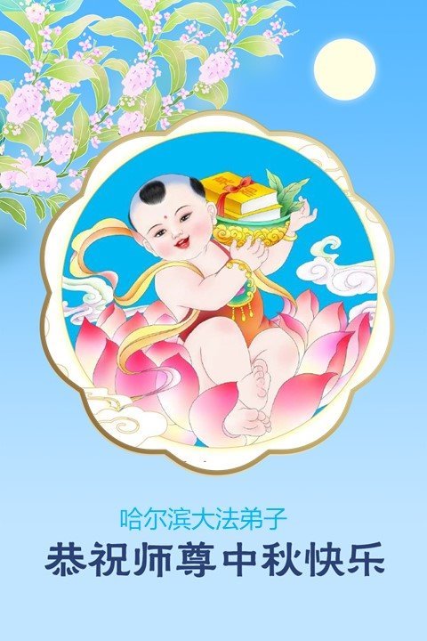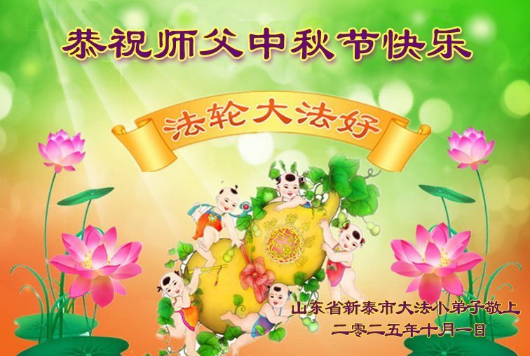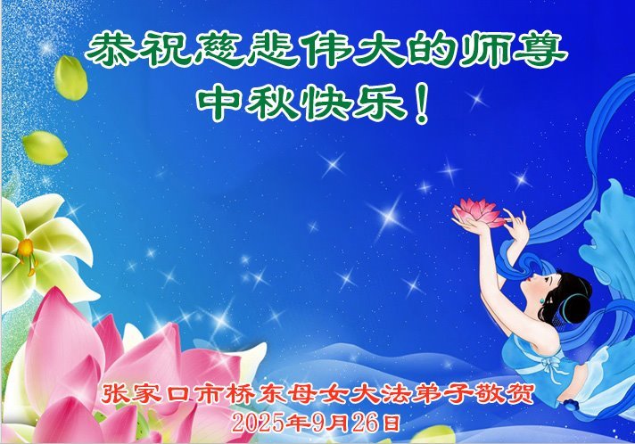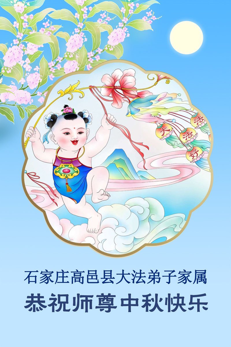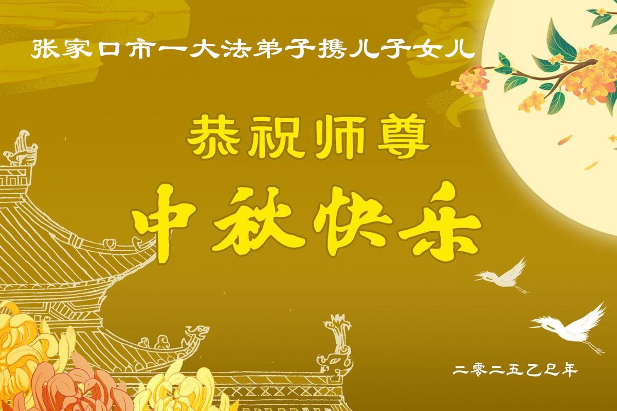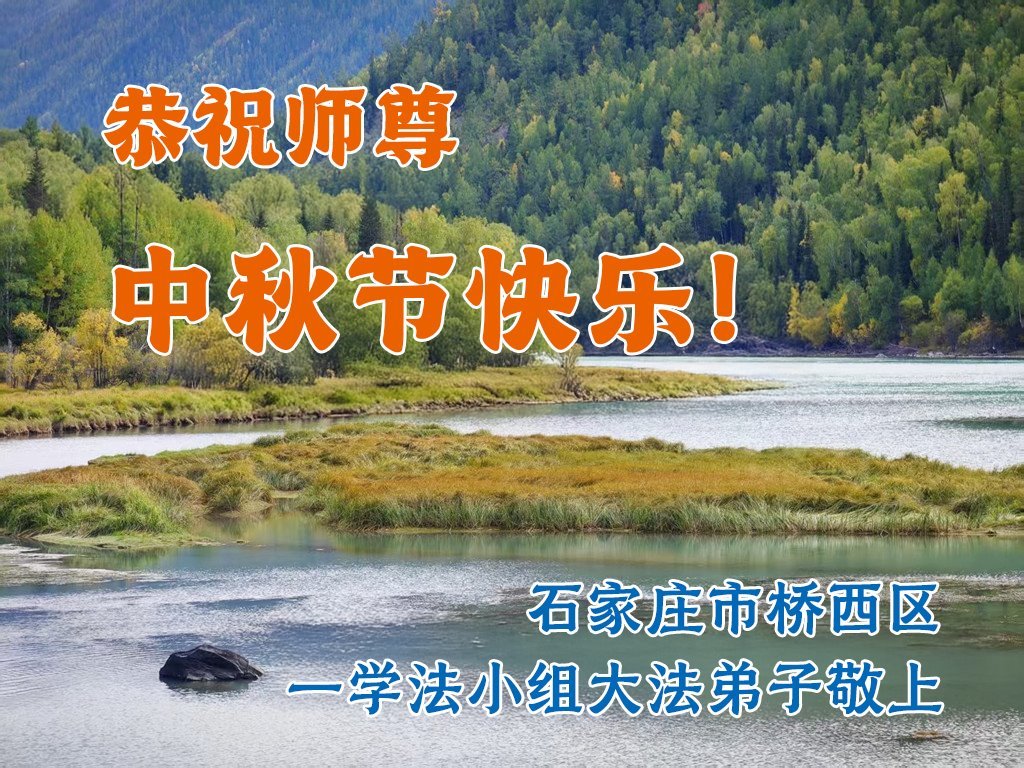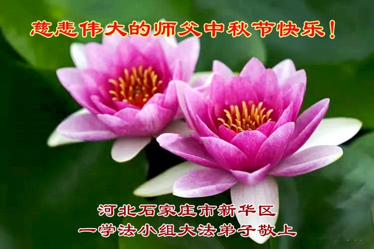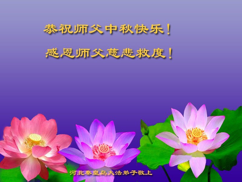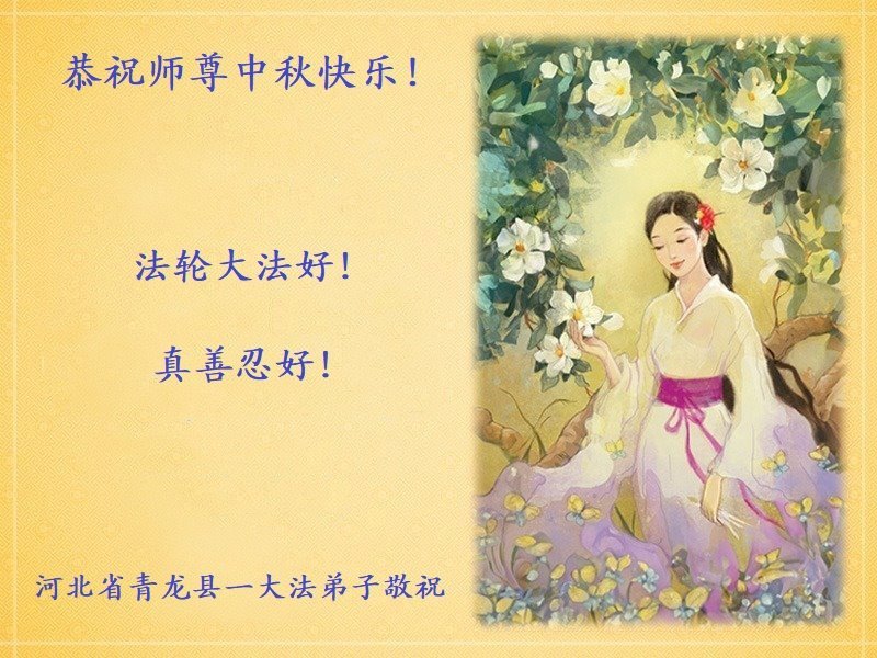 我們大法弟子攜家人和明真相的世人恭祝師尊中秋節快樂!師尊辛苦了!謝謝師尊的慈悲苦度!弟子一定破除舊勢力的安排,消除間隔,形成強大的整體,反迫害,救度眾生。弟子們要多學法,學好法,發好正念,向內找,兌現自己的誓約,跟師父回家。