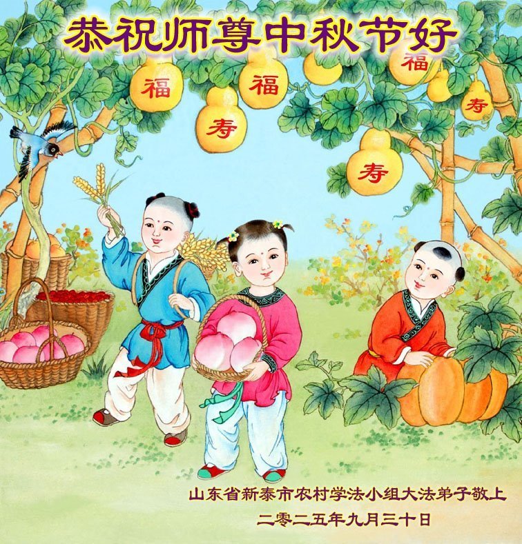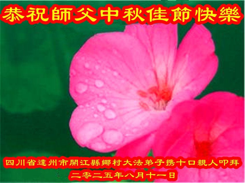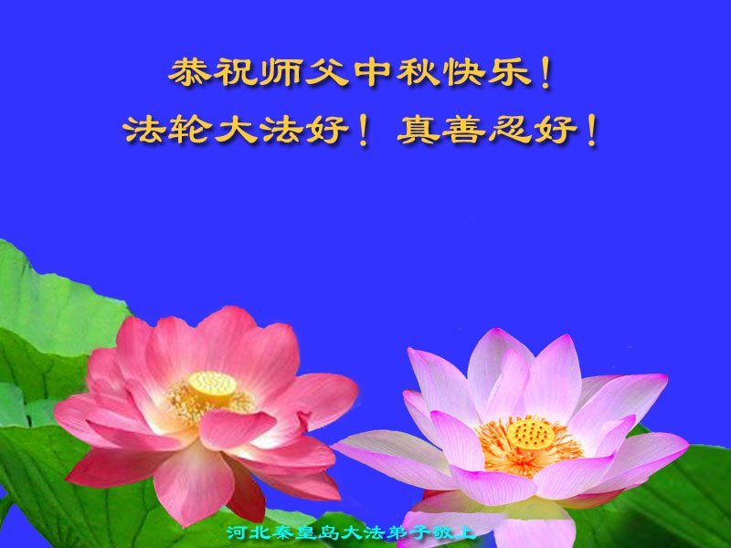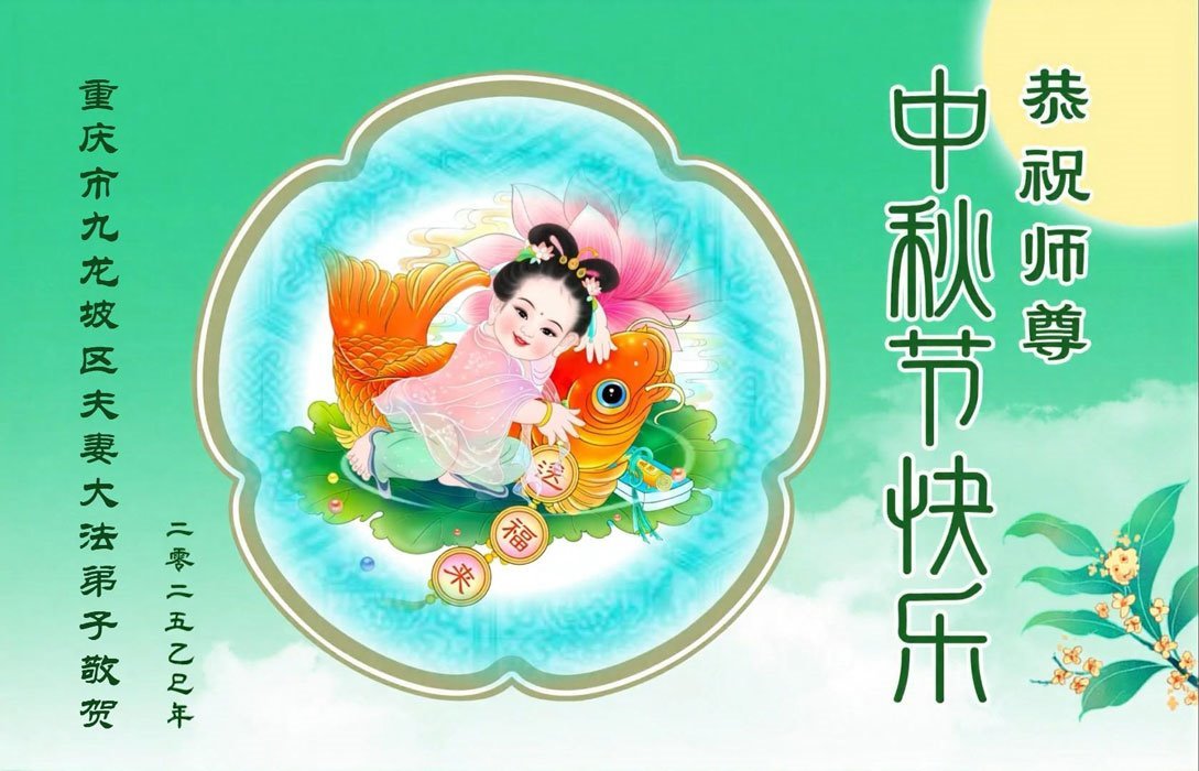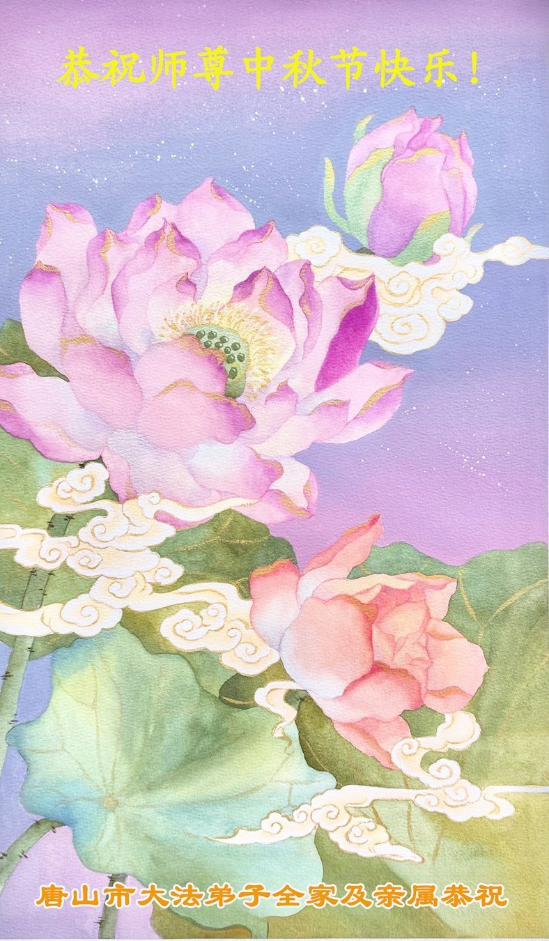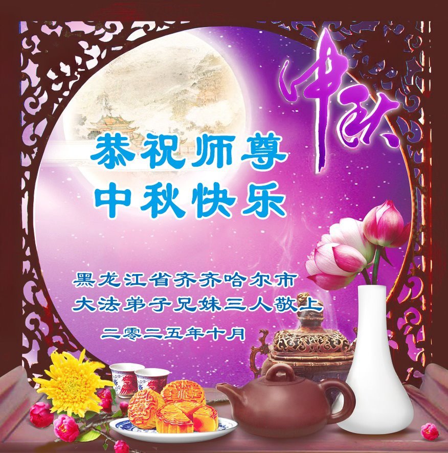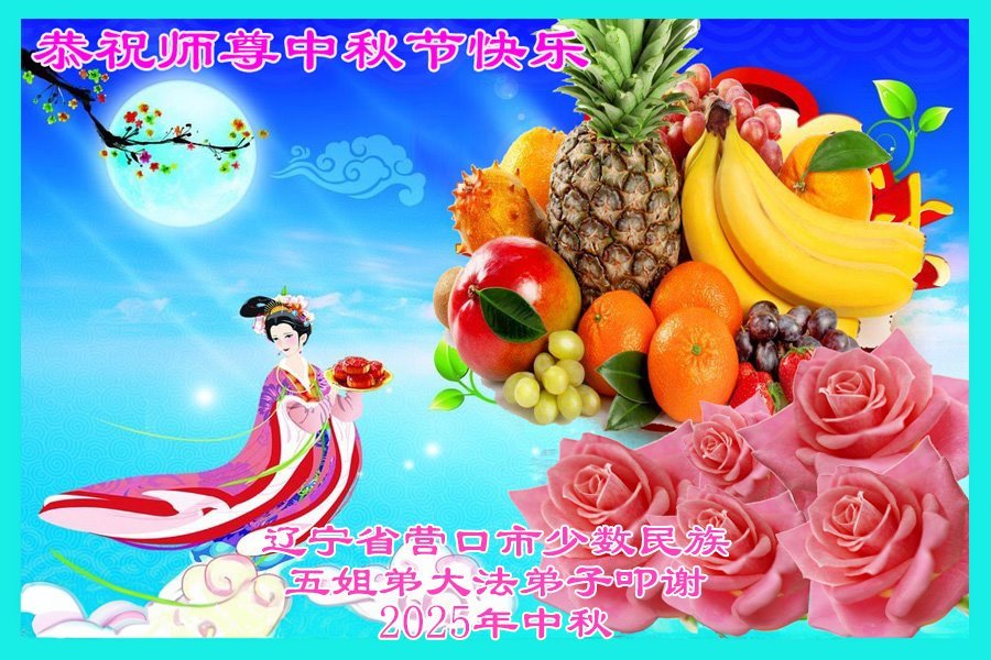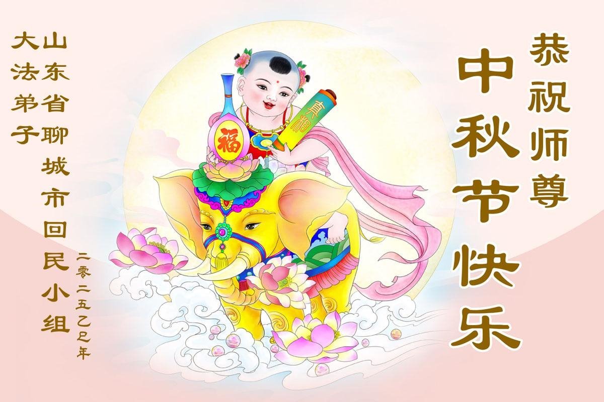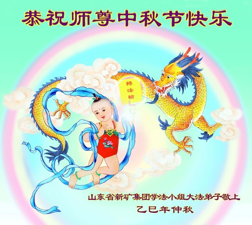 我們大法弟子攜家人和明真相的世人恭祝師尊中秋節快樂!師尊辛苦了!謝謝師尊的慈悲苦度!弟子一定破除舊勢力的安排,消除間隔,形成強大的整體,反迫害,救度眾生。弟子們要多學法,學好法,發好正念,向內找,兌現自己的誓約,跟師父回家。