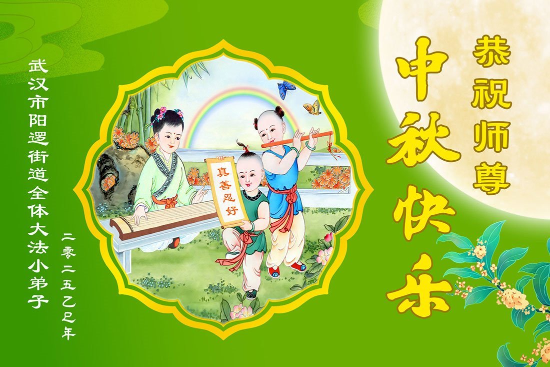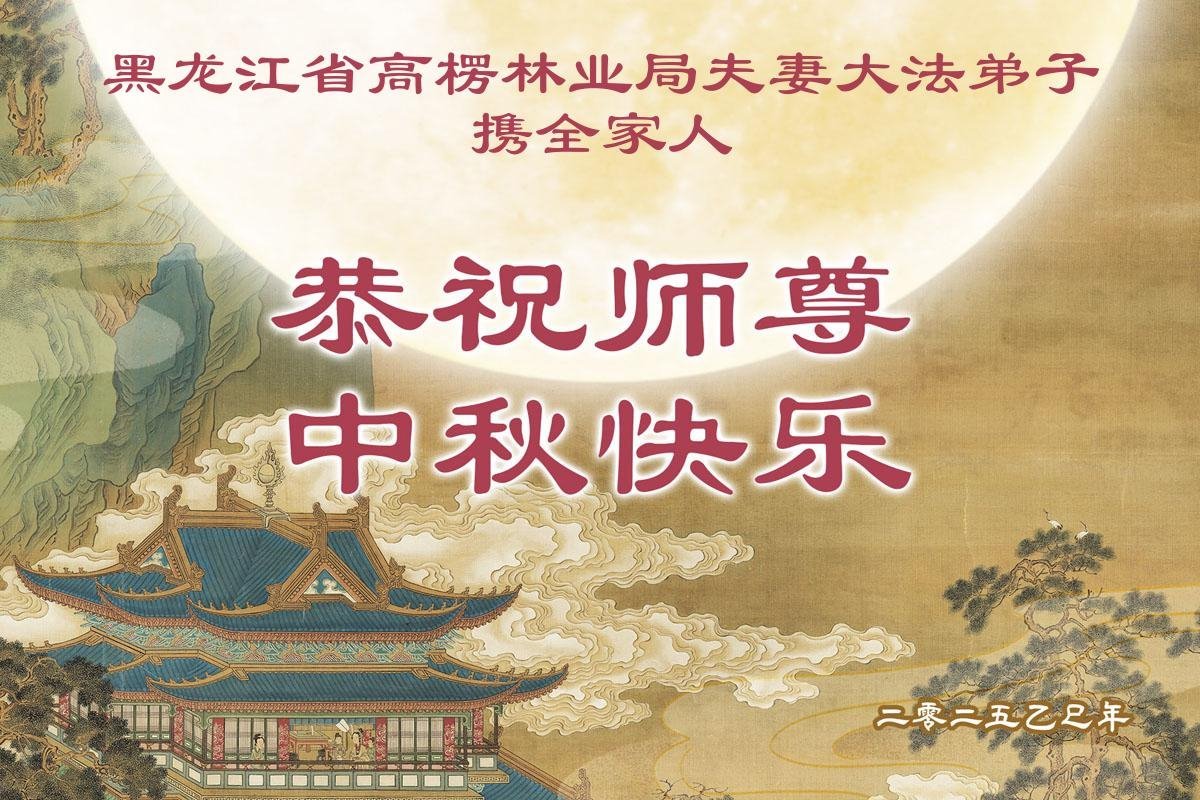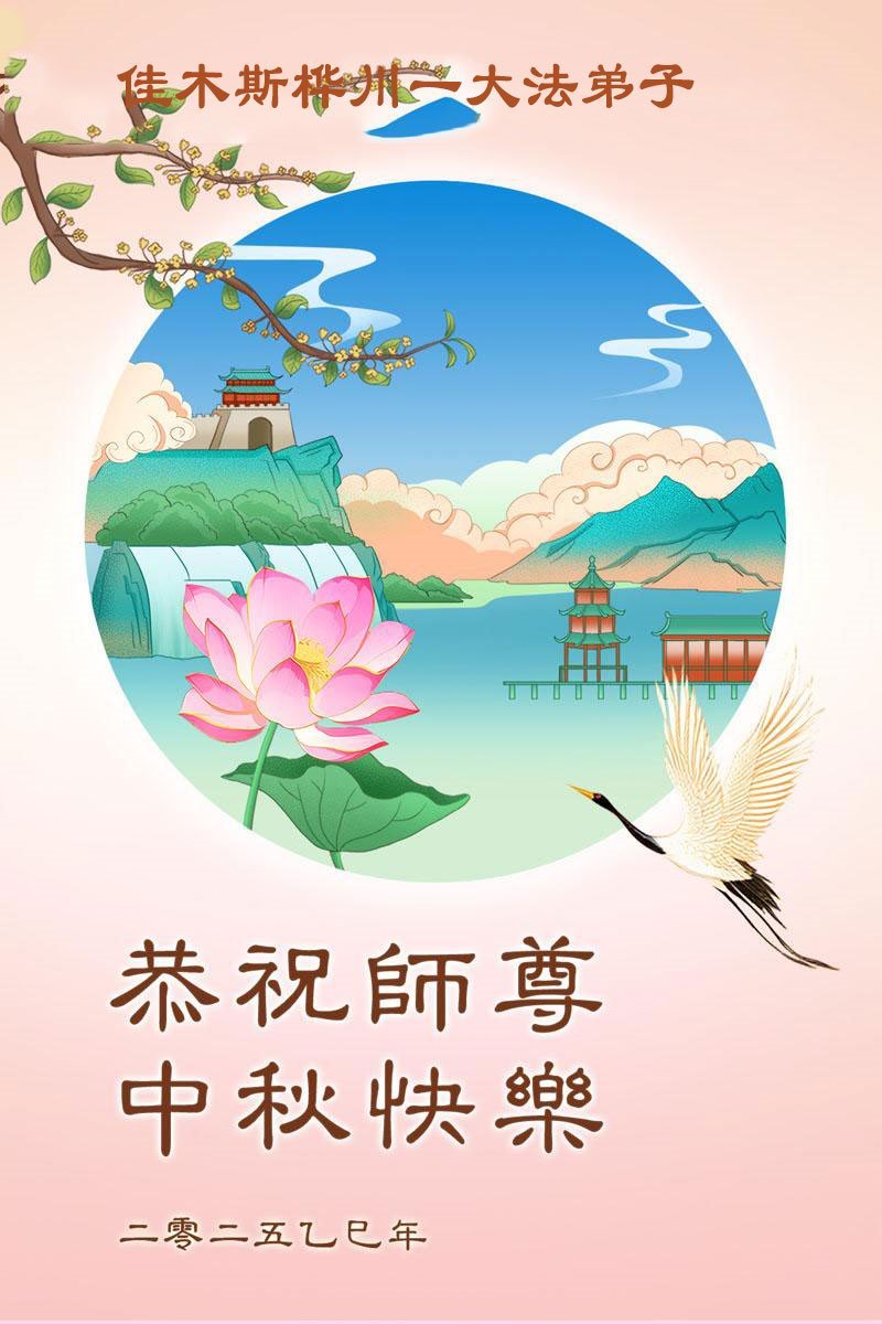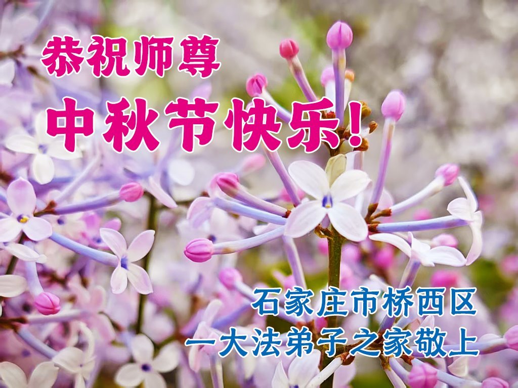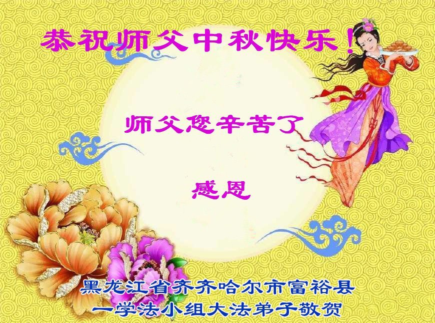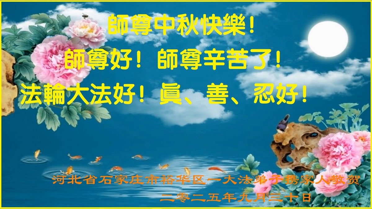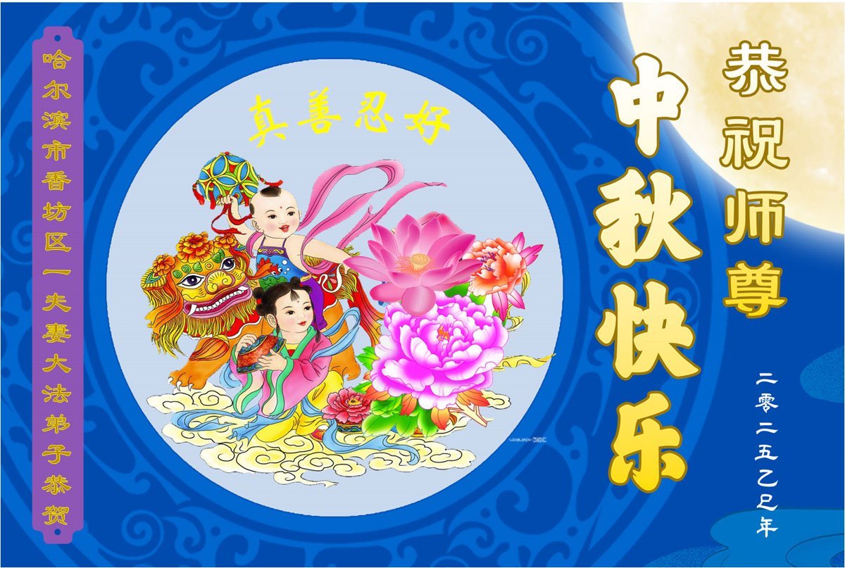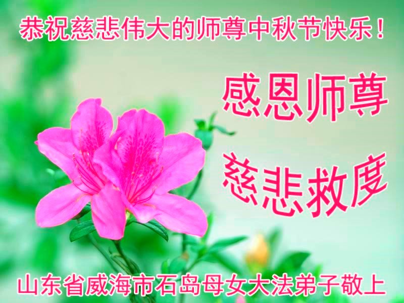 我們大法弟子攜家人和明真相的世人恭祝師尊中秋節快樂!師尊辛苦了!謝謝師尊的慈悲苦度!弟子一定破除舊勢力的安排,消除間隔,形成強大的整體,反迫害,救度眾生。弟子們要多學法,學好法,發好正念,向內找,兌現自己的誓約,跟師父回家。