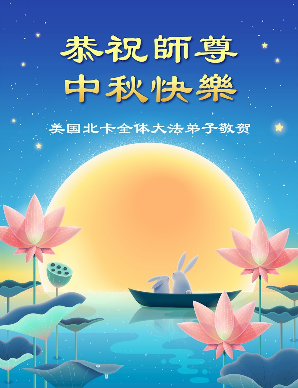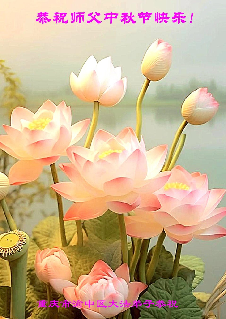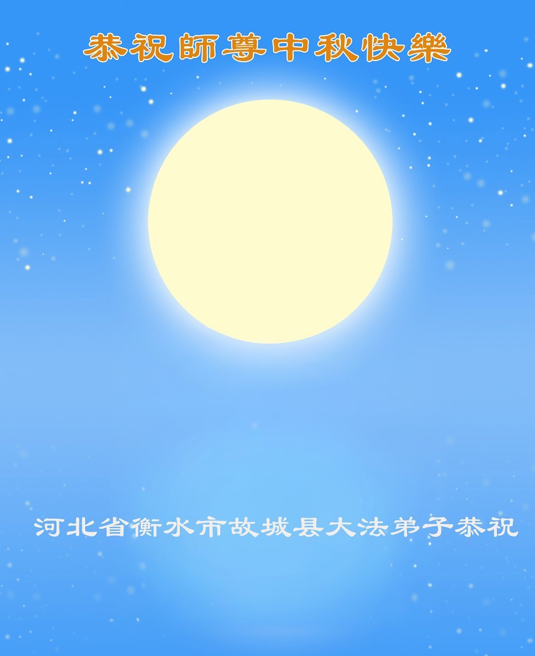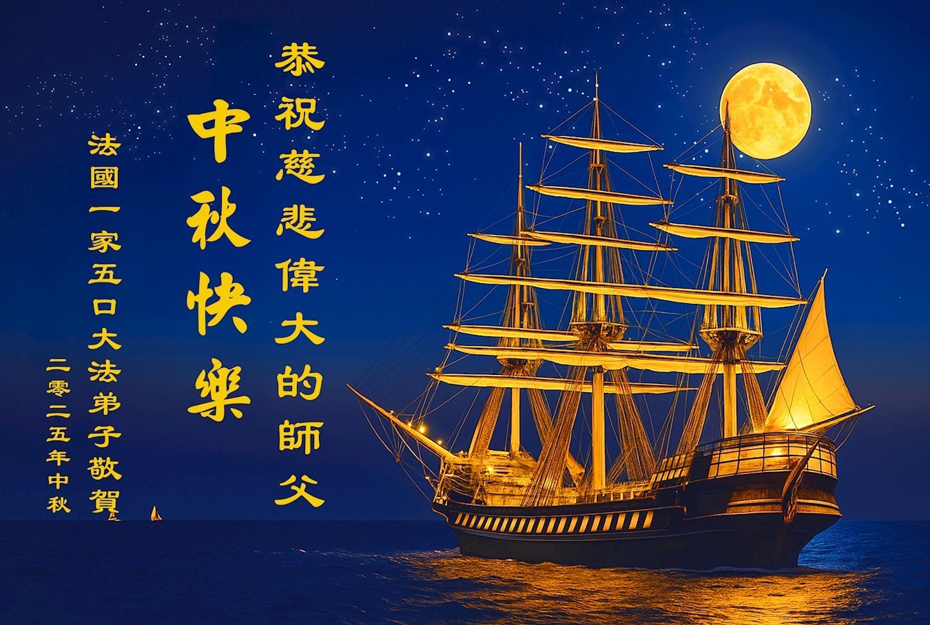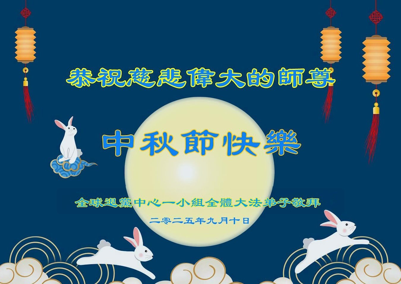 恭祝慈悲偉大的師父中秋節快樂!祝願全體大法弟子在修煉中堅守誓言,助師救度眾生,隨師父一起回歸真正的家園。(譯文)