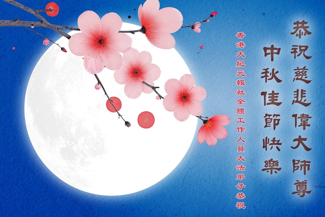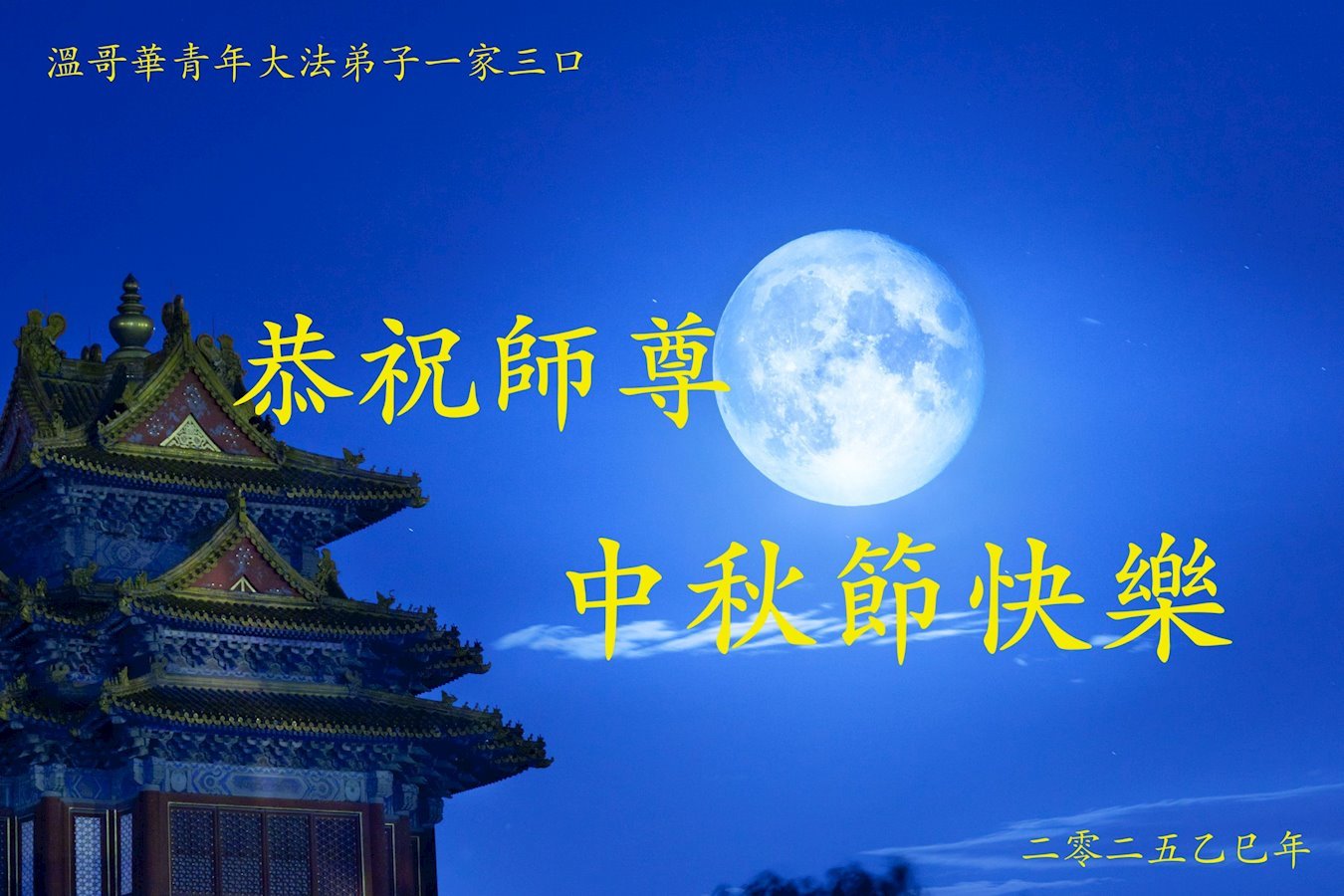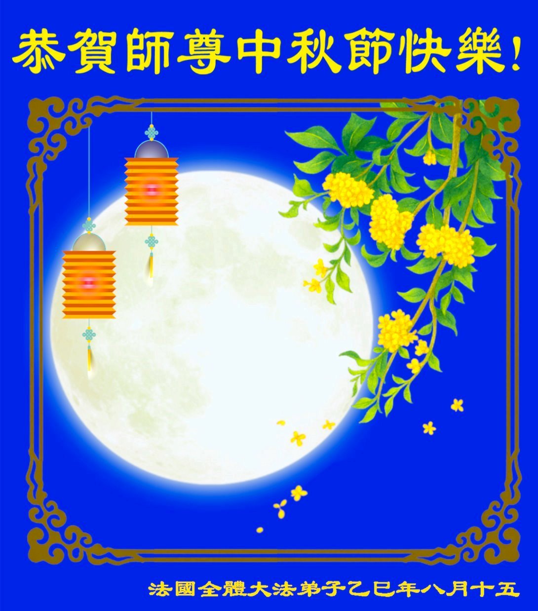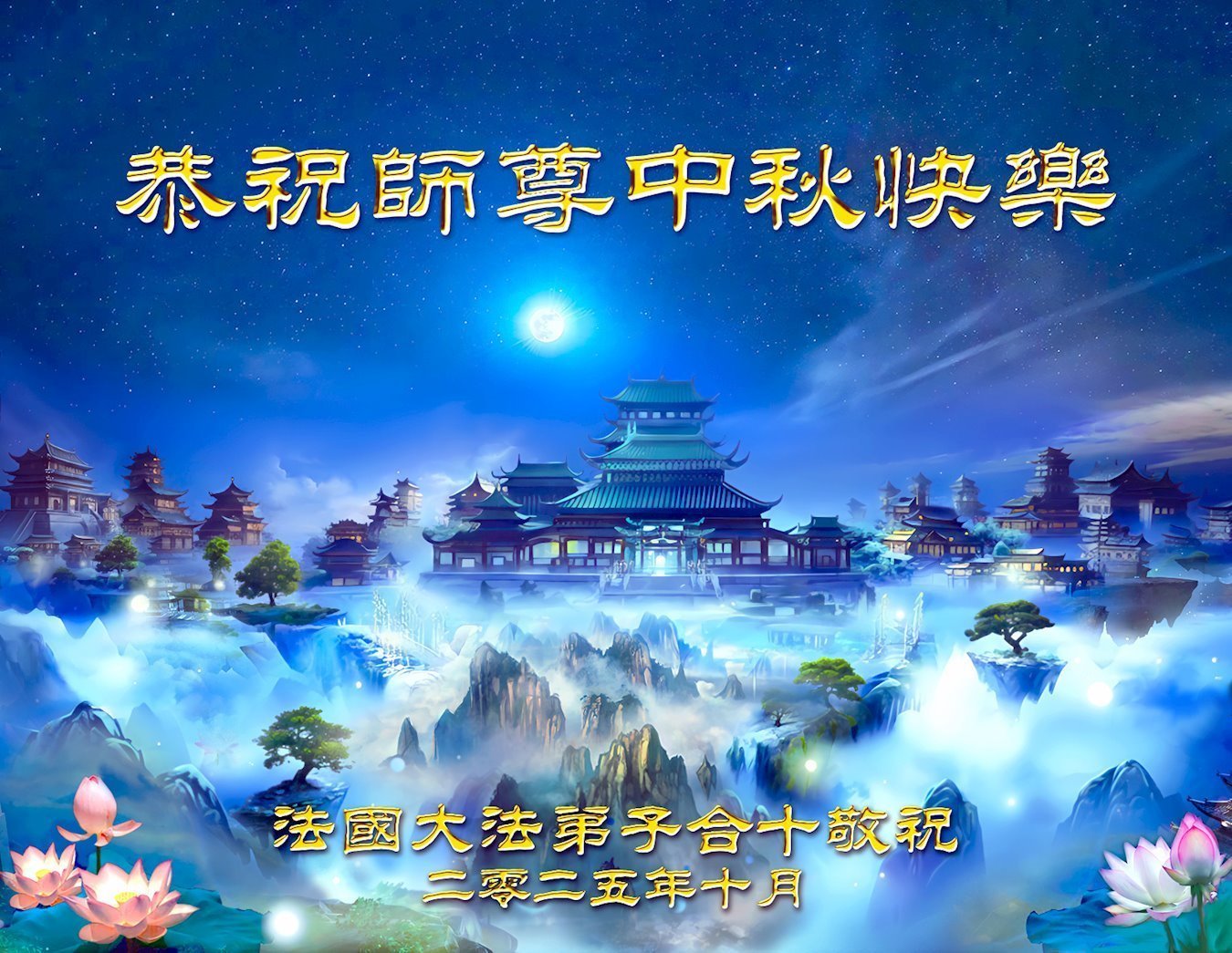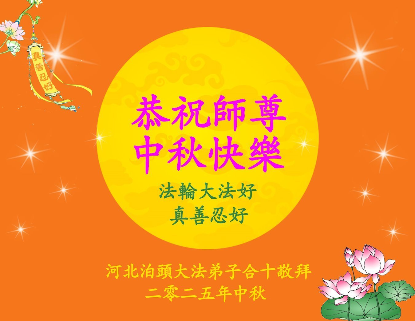 恭祝慈悲偉大的師父中秋節快樂!祝願全體大法弟子在修煉中堅守誓言,助師救度眾生,隨師父一起回歸真正的家園。(譯文)