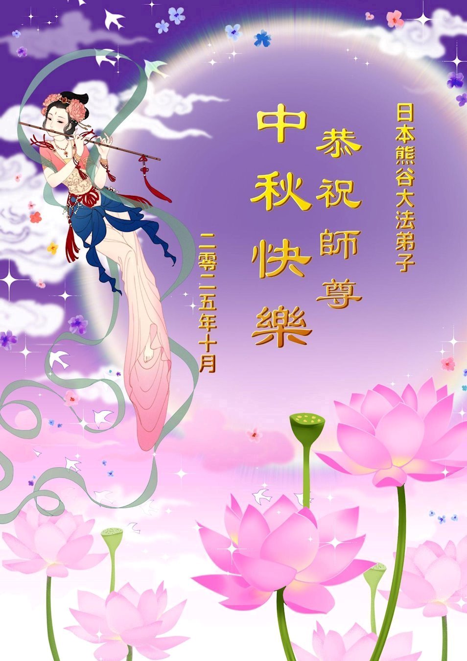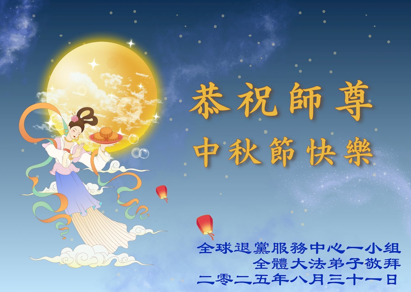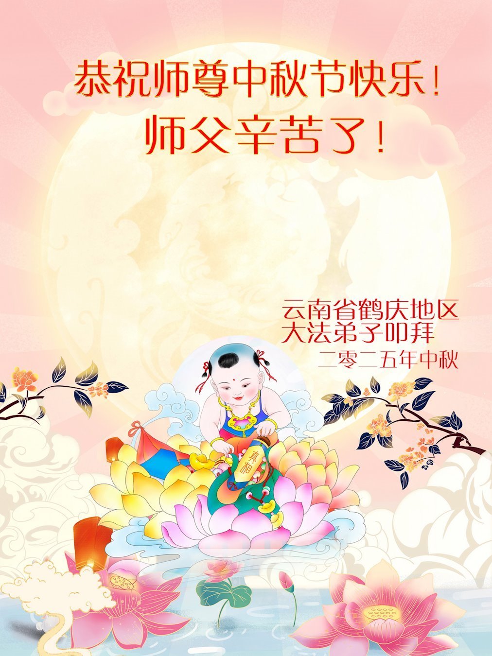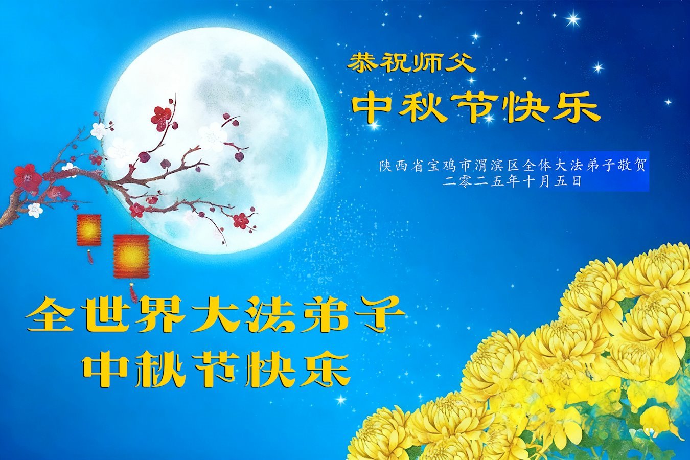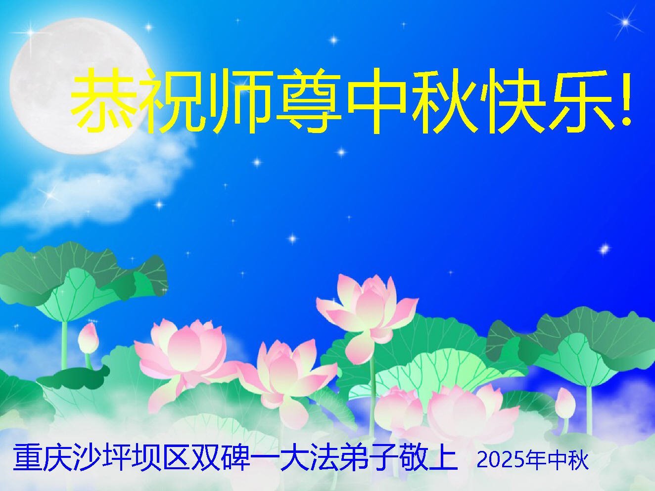 Dear and benevolent Master, I congratulate you on this Mid-Autumn Festival and wish that all Dafa disciples, including myself, remain true to our vows in our cultivation and in saving sentient beings, so that together with you, we may return to our true home。