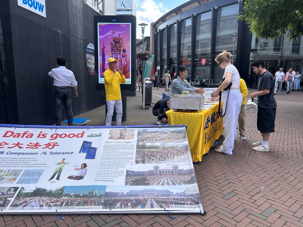 一位先生簽名支持法輪功學員反迫害後,熱烈地與學員交談,說週日還有開放日,邀請學員們第二天繼續來舉辦活動。他指著真相傳單上《轉法輪》圖片問學員在哪裏可以找到這本書,學員告訴他網上可以免費下載閱讀。之後,他還想學習法輪功功法,學員幫他找到荷蘭煉功點的地址後,他才慢慢離開。