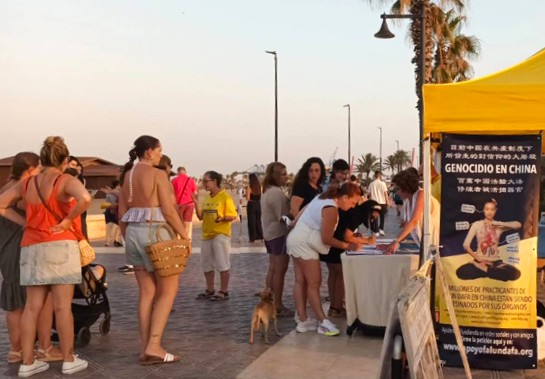 法輪功學員在這裏設立信息展位,嚮往來遊客們發放真相傳單,揭露中共殘酷迫害法輪功學員以及活摘器官的累累惡行,許多遊客攜全家簽署請願書:呼籲停止中共對法輪功學員的迫害和活摘器官行徑,該簽名表將提交給西班牙眾議院請願委員會。同時也有學員演示法輪大法的五套功法,展示大法的美好與祥和。