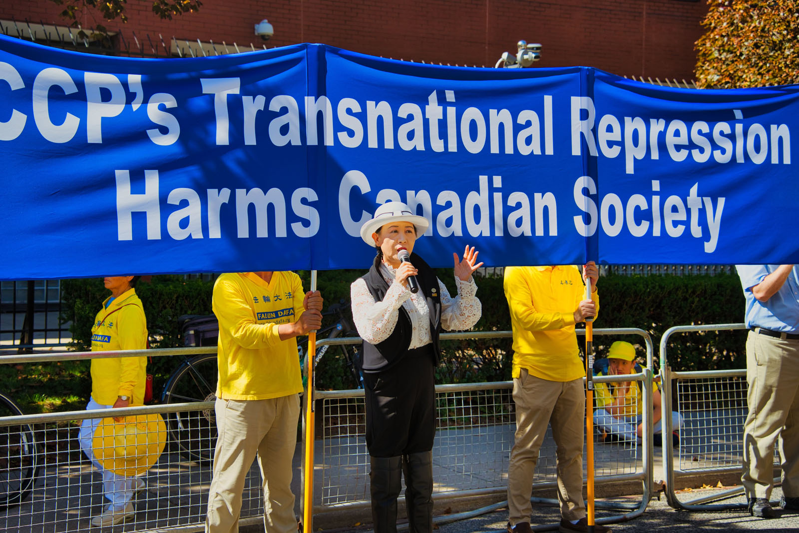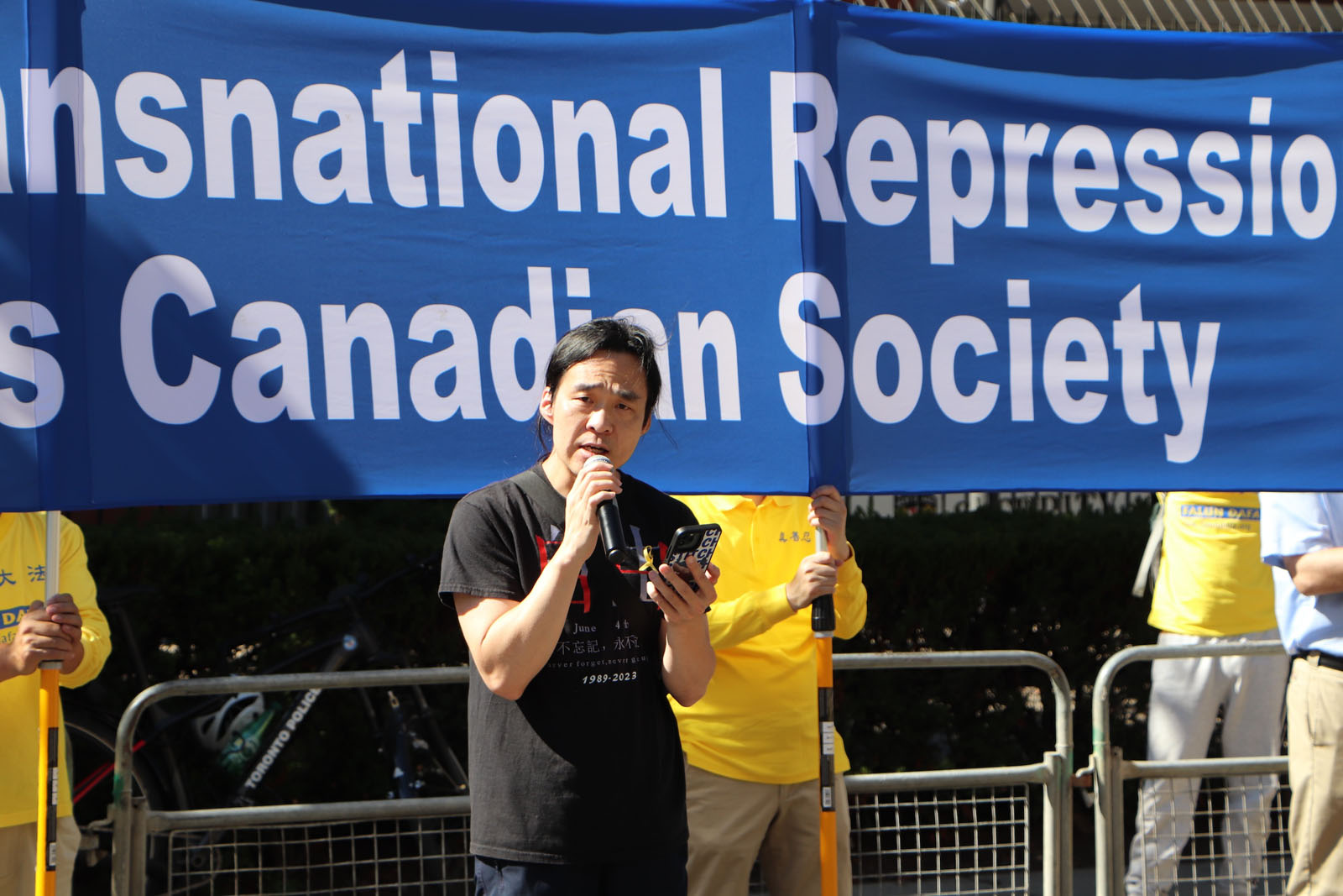 中國民主黨加拿大委員會理事劉岩在集會上發言,他說:「我們有權利自由地表達觀點;我們有權利追求真、善、忍的信仰;我們有權利批判獨裁;我們有權利反對中共;我們有權利享受自由、民主和生而為人的尊嚴。」他呼籲各界團結起來,反對中共的滲透,反對跨國鎮壓,捍衛自由。