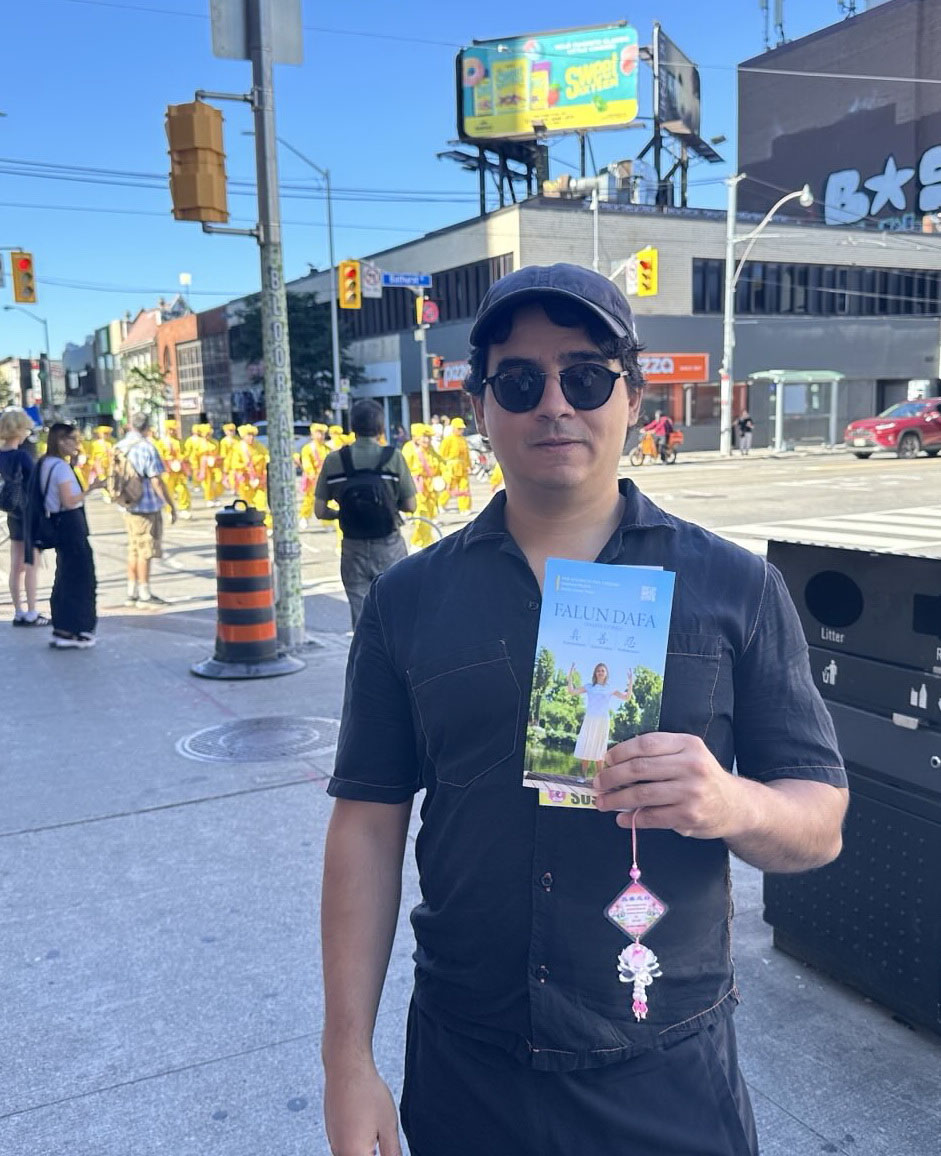 瑞恩(Ryan)居住在密西沙加,他表示自己在兩週前開始參加法輪功學員舉辦的免費教功班,他說:「我已經上了兩節課,我感到很平和,很喜歡,會繼續參加。」他表示自己還在學習功法動作,很感謝學員的幫助。「過去的幾個月我感覺乏力,煉功幫助我充滿能量,我希望能多多煉習。」瑞恩還說:「真、善、忍是聖潔的合一。幫助你去理解和覺悟,用積極的態度看待他人,互相支持。」