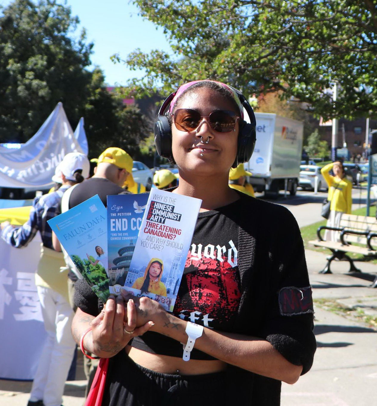在遊行隊伍準備出發時,法蒂瑪(Fatima)正好路過,在與學員的交流中她了解到了中共迫害法輪功學員的罪行。她表示自己完全反對中共活摘法輪功學員器官,以及跨國鎮壓海外法輪功學員。「加拿大是自由的國度,不可以發生威脅加拿大民眾的事情。」她認為中共威脅神韻藝術團的演出,是因為演出中揭露了中共迫害法輪功學員的真相。她還表示自己要在請願書上簽字,呼籲加拿大政府制止中共的跨國鎮壓行徑。