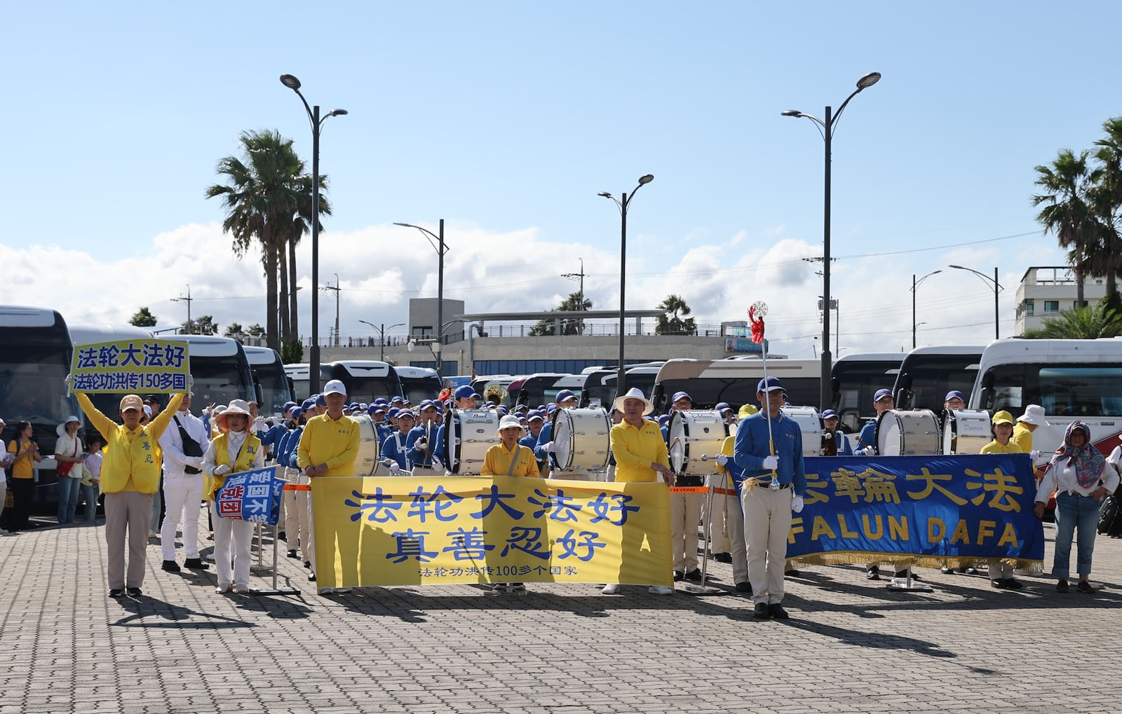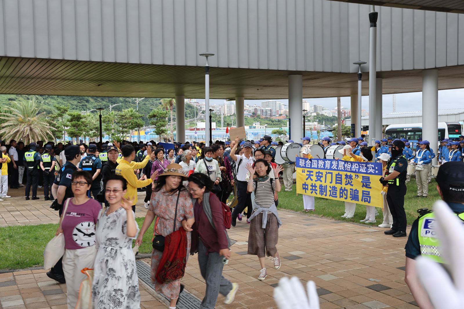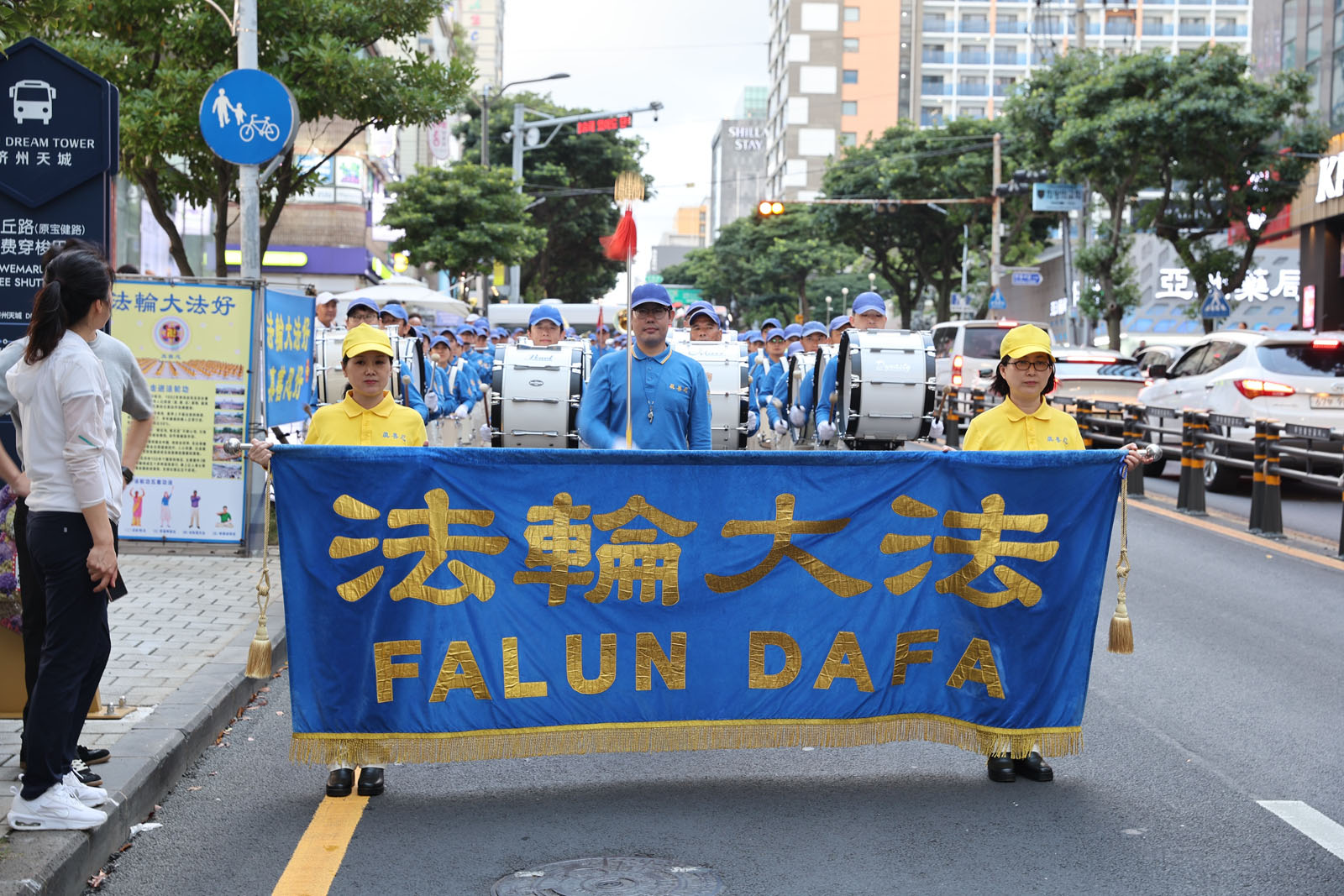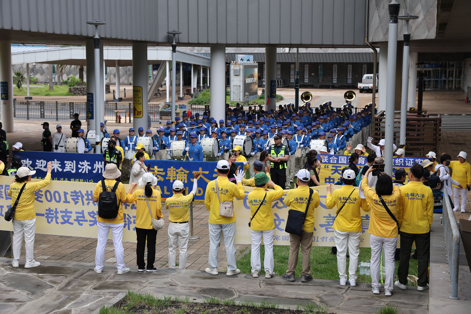 法輪功學員早早來到濟州港碼頭,最前方掛上了「歡迎來到濟州」的橫幅。當第一批遊客出來時,天國樂團奏響了《法輪大法好》,許多中國遊客面帶笑容,揮手致意。一些勇敢的中國遊客忙著拍攝樂團演奏和學員們打出的橫幅。