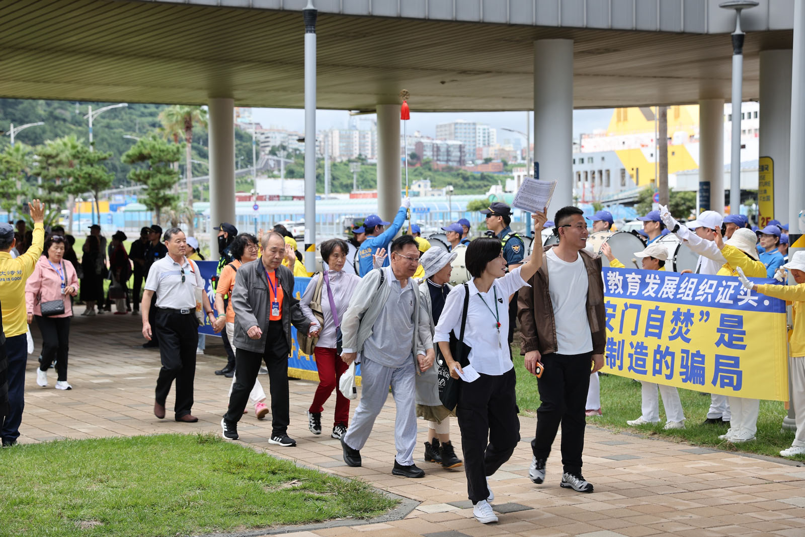 學員們邊舉著橫幅,邊對遊客揮手,高喊「法輪大法好,真善忍好」。一些會中文的學員還跟著遊客走,大聲講真相:「中共不等於中國,愛國不等於愛黨。我們是為你們而來。危難來時一定要記住『法輪大法好』。」不少遊客聽後面露喜色,點頭、豎起大拇指,有的還主動與學員握手。