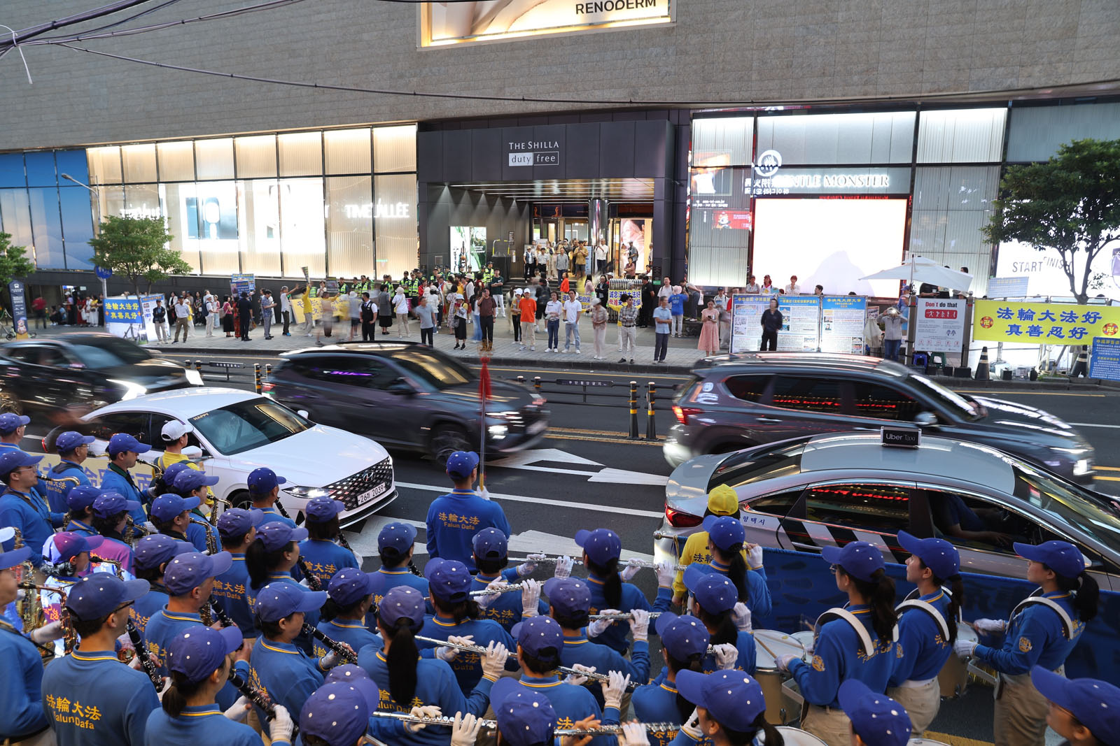 江汀港講真相活動結束後,學員們又前往中國遊客必到的濟州市內「新羅免稅店」和「樂天免稅店」。傍晚時分,天國樂團先在樂天免稅店前演奏,音樂一響,店內的中國遊客蜂擁而出,擠滿正門口,他們聽著音樂,看著真相橫幅及展板,有些人震驚得目瞪口呆。