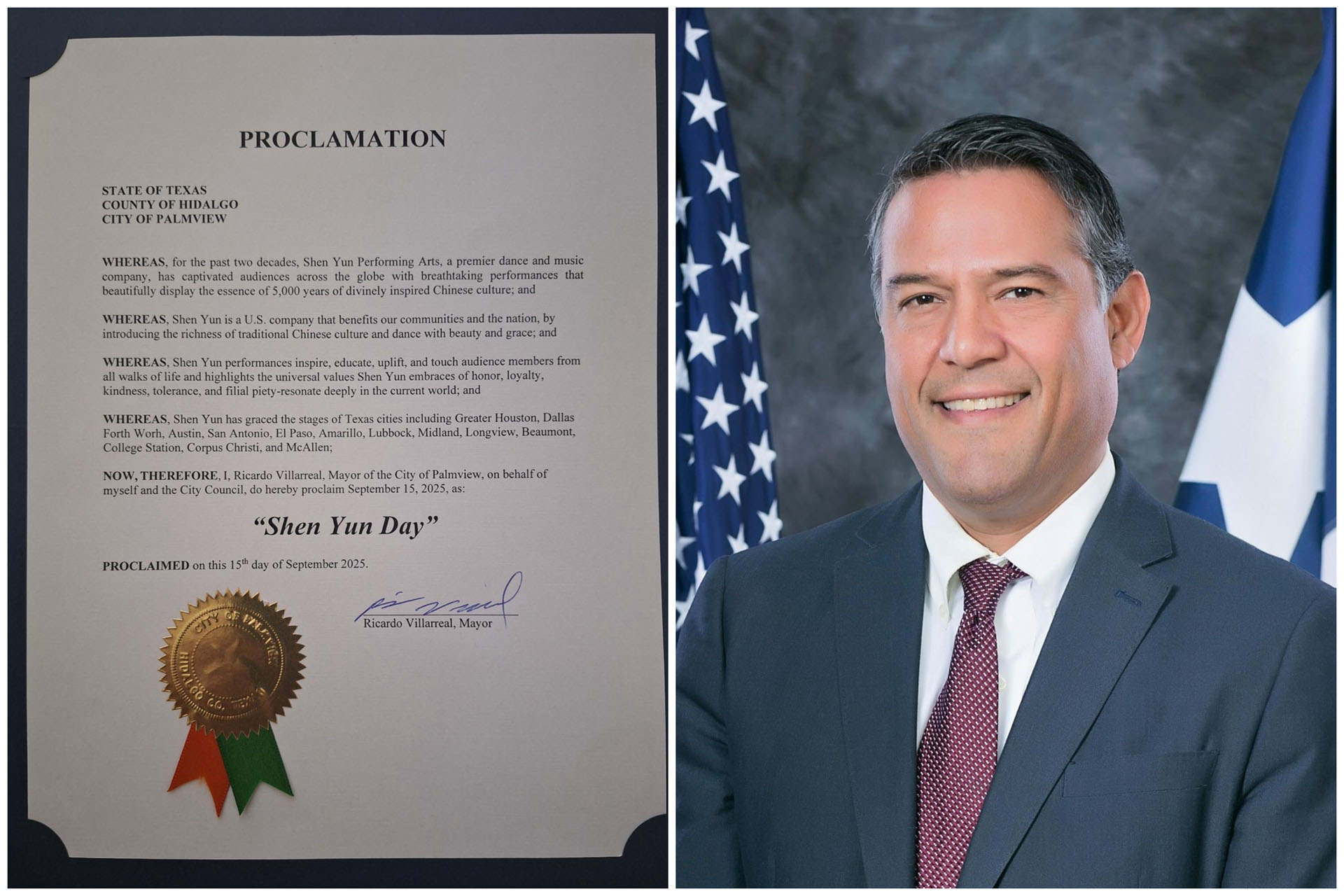![]() 圖1:德克薩斯州棕櫚景市市長裏卡多﹒比利亞雷亞爾(Ricardo Villarreal)宣布,二零二五年九月十五日為該市「神韻日」。 |