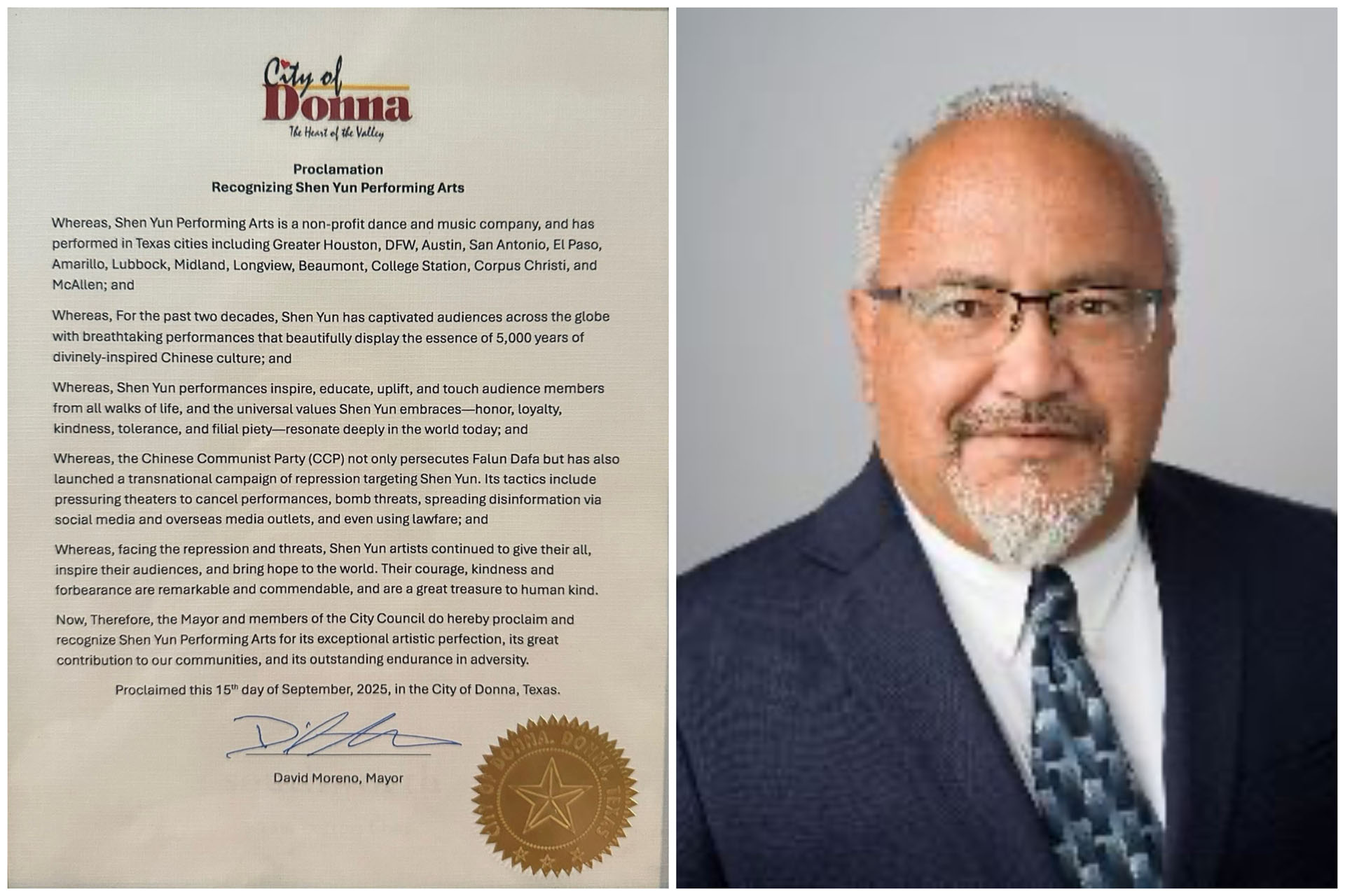 ![]() 圖2:二零二五年九月十五日,德克薩斯州唐納市市長大衛﹒莫雷諾(David Moreno)褒獎神韻。 |