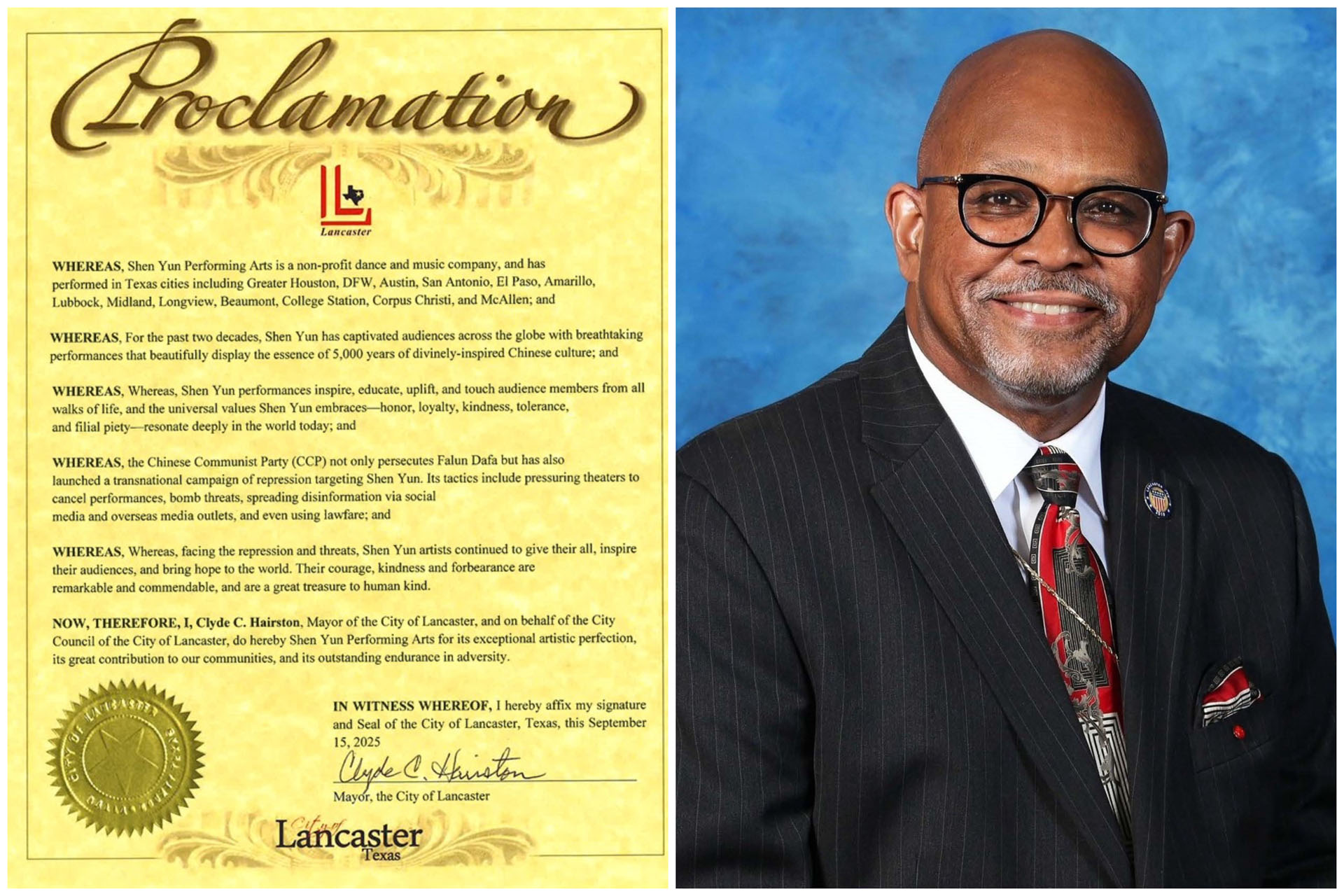 ![]() 圖3:二零二五年九月十五日,德克薩斯州蘭卡斯特市市長克萊德﹒C﹒海爾斯頓(Clyde C. Hairston)向神韻頒發褒獎。 |