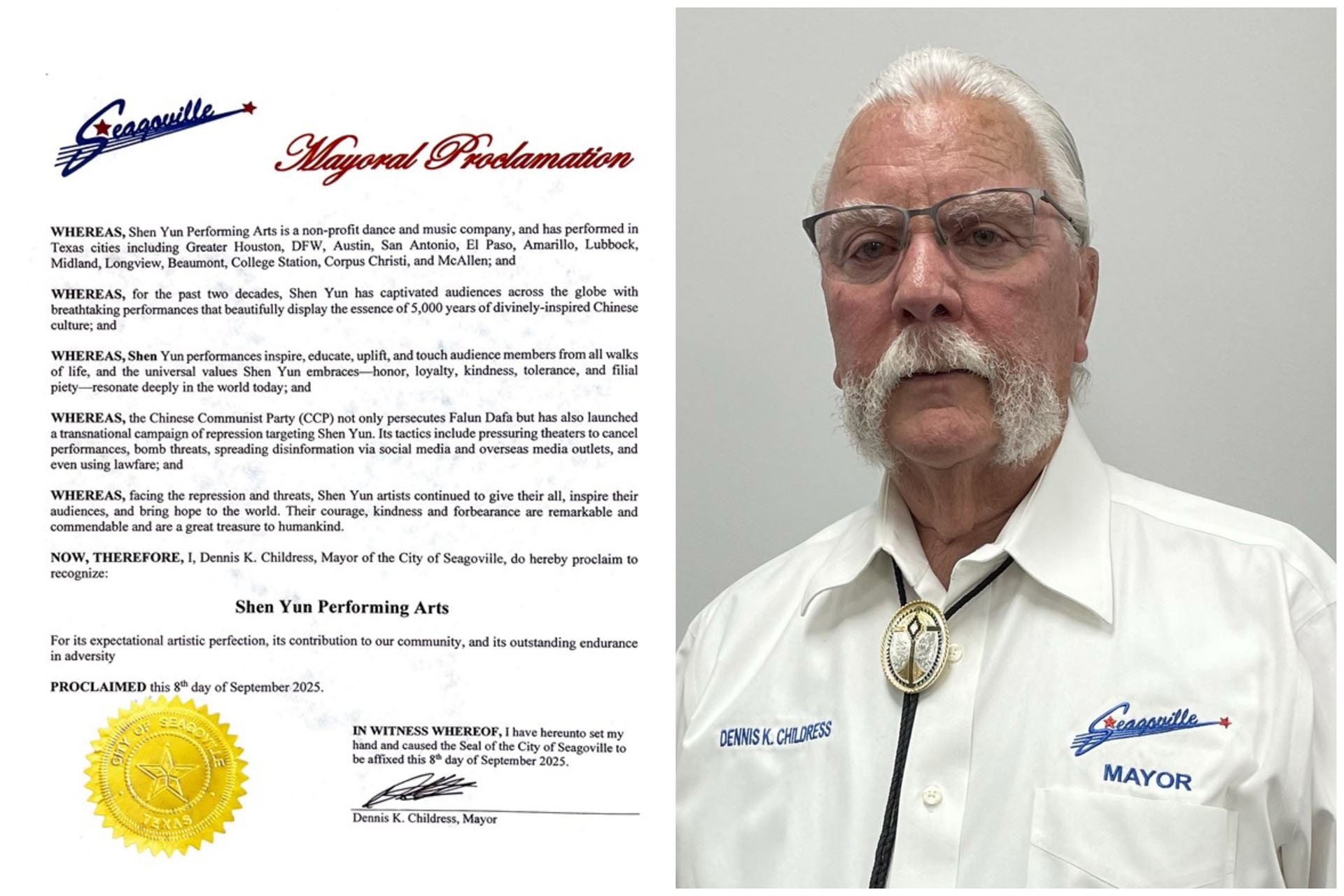 ![]() 圖5:二零二五年九月八日,德克薩斯州西戈維爾市長丹尼斯﹒K﹒奇爾德里斯(Dennis K. Childress)向神韻頒發褒獎。 |