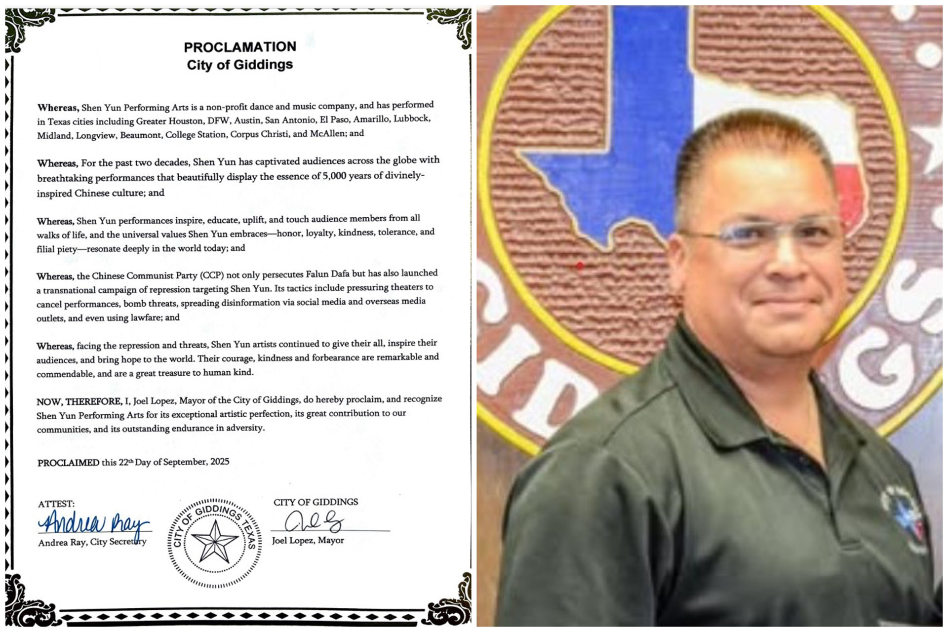 二零二五年九月二十二日,美國德克薩斯州吉丁斯市(Giddings)市長喬﹒洛佩茲(Joel Lopez)為神韻藝術團頒發褒獎,表彰神韻以精妙絕倫的演出展現了神傳文化的精髓,造福著社區與國家,也讚揚神韻藝術家們面對中共跨國鎮壓時展現出勇氣與善良,是人類寶貴的精神財富。