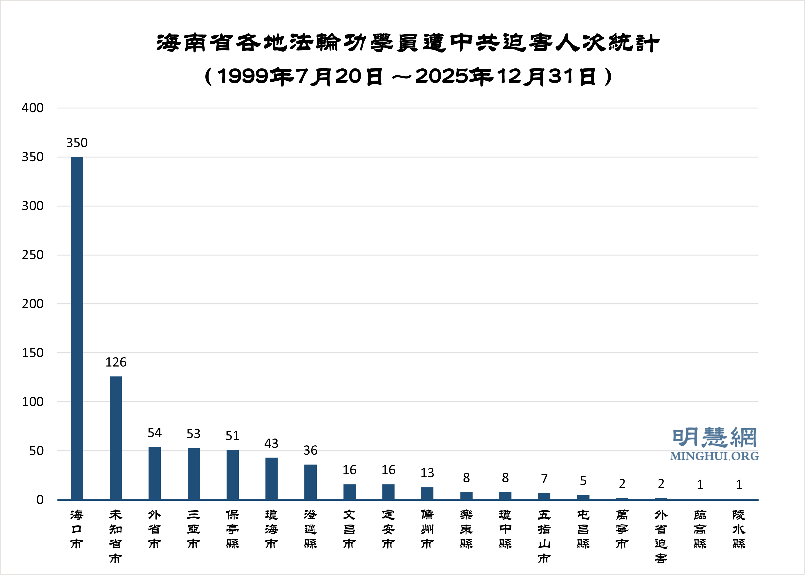 據明慧網數據統計,一九九九年七月二十日至二零二五年十二月三十一日,海南省法輪功學員被中共惡黨用各種手段迫害總計792人次。
