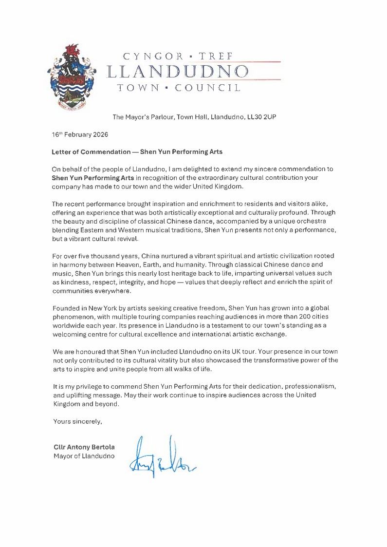 二月十六日,貝托拉市長向神韻英國演出主辦方發來表彰信,感謝神韻藝術團為當地及英國社會所作出的卓越文化貢獻,並對藝術團的專業精神表示高度肯定。