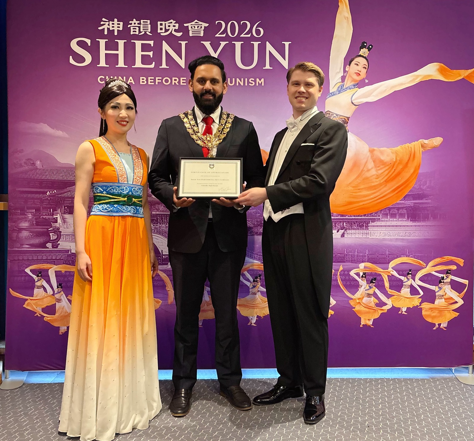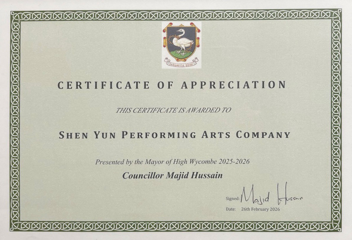 【明慧網二零二六年二月二十八日】(明慧網英國記者站報導)二零二六年二月二十六日,神韻環球藝術團在英國海威科姆市的威科姆天鵝劇院(Wycombe Swan Theatre)演出觀眾爆滿。當地市長馬吉德﹒侯賽因(Majid Hussain)專程來到劇院向神韻藝術團頒發感謝狀,以表彰其為當地社區帶來的精彩演出與文化貢獻。