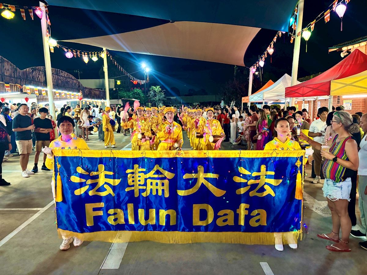 其中,在二月十六日除夕之夜,墨爾本西部的布雷布魯克(Braybrook)區舉行了熱鬧的廟會,各族裔民眾齊聚一堂,辭舊迎新。法輪功腰鼓隊受邀開場表演,隨後多次繞場遊行。金黃色的演出服非常吸睛,學員們隨著整齊有力的鼓點變換隊形,吸引觀眾駐足觀賞、拍照。他們的精彩表演成為當晚慶典的一大亮點。
