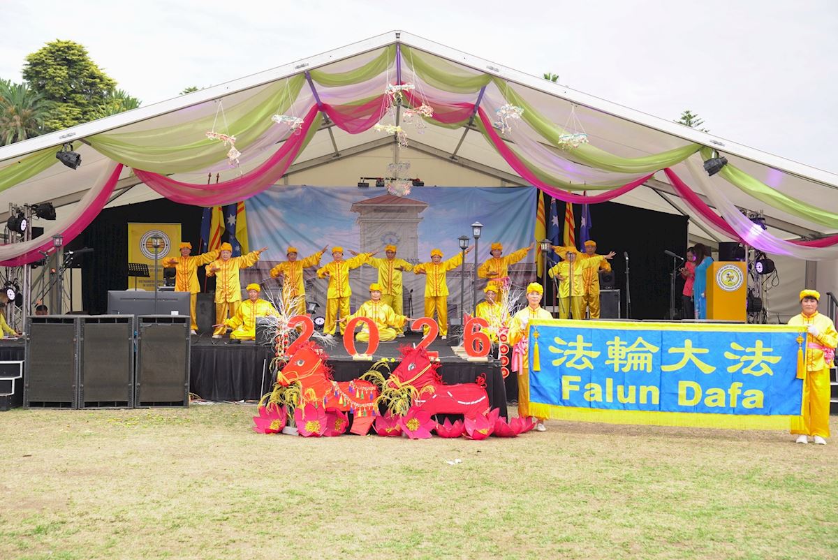 【明慧網二零二六年三月五日】(明慧澳洲墨爾本記者站報導)二零二六丙午馬年,從一月下旬開始,直至黃曆新年的元宵節,從西區、東區到市中心,墨爾本華人和越裔社區舉辦了多場新春慶典。活動期間,法輪功團體應邀演出,他們身穿獨具特色的演出服,以亮麗的色彩、精彩的表演為當地節慶送去祝福、增添喜慶,也贏得了觀眾們的掌聲和讚譽。