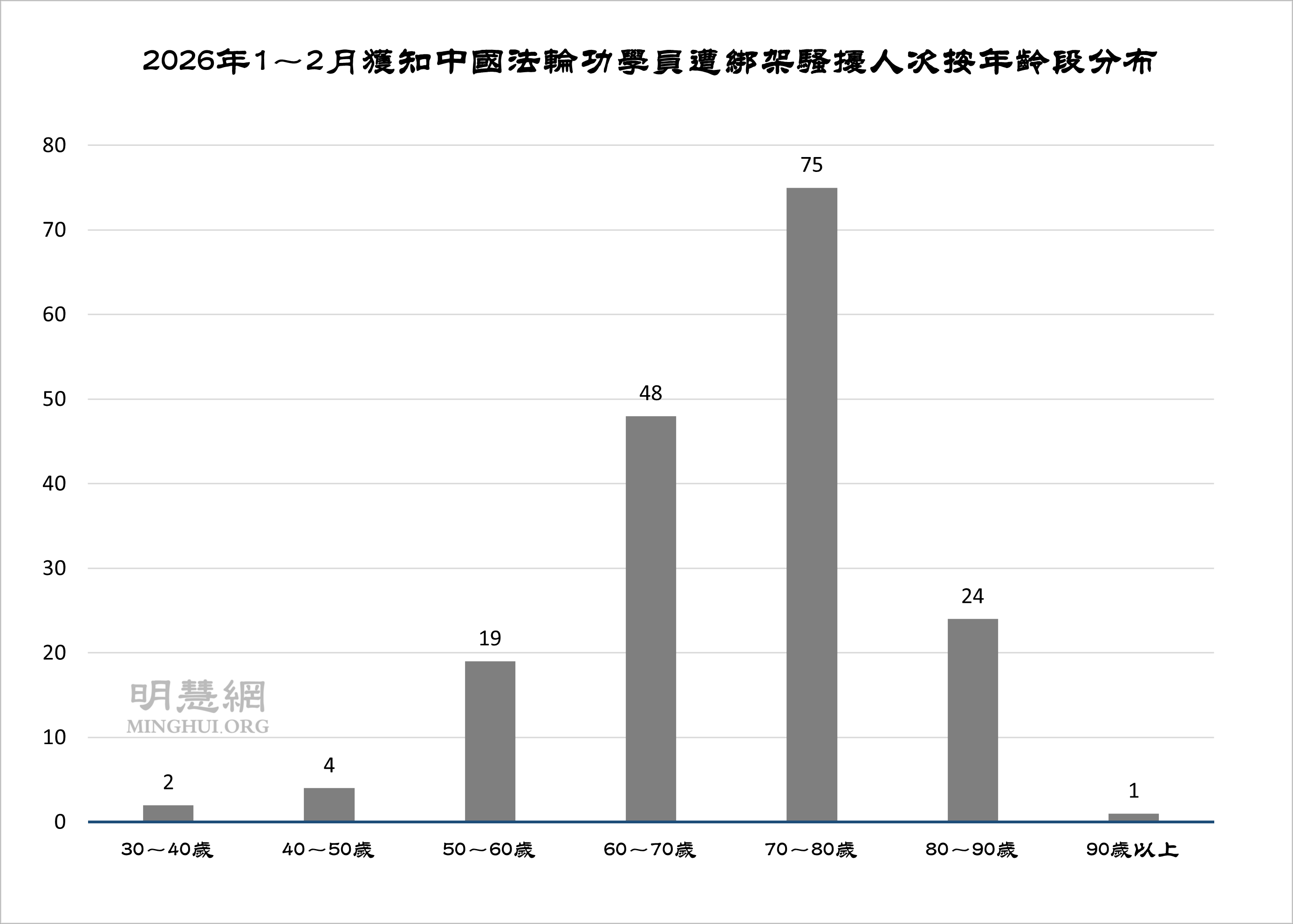![]() 圖3:2026年1~2月獲知中國法輪功學員遭綁架騷擾人次按年齡段分布 |
