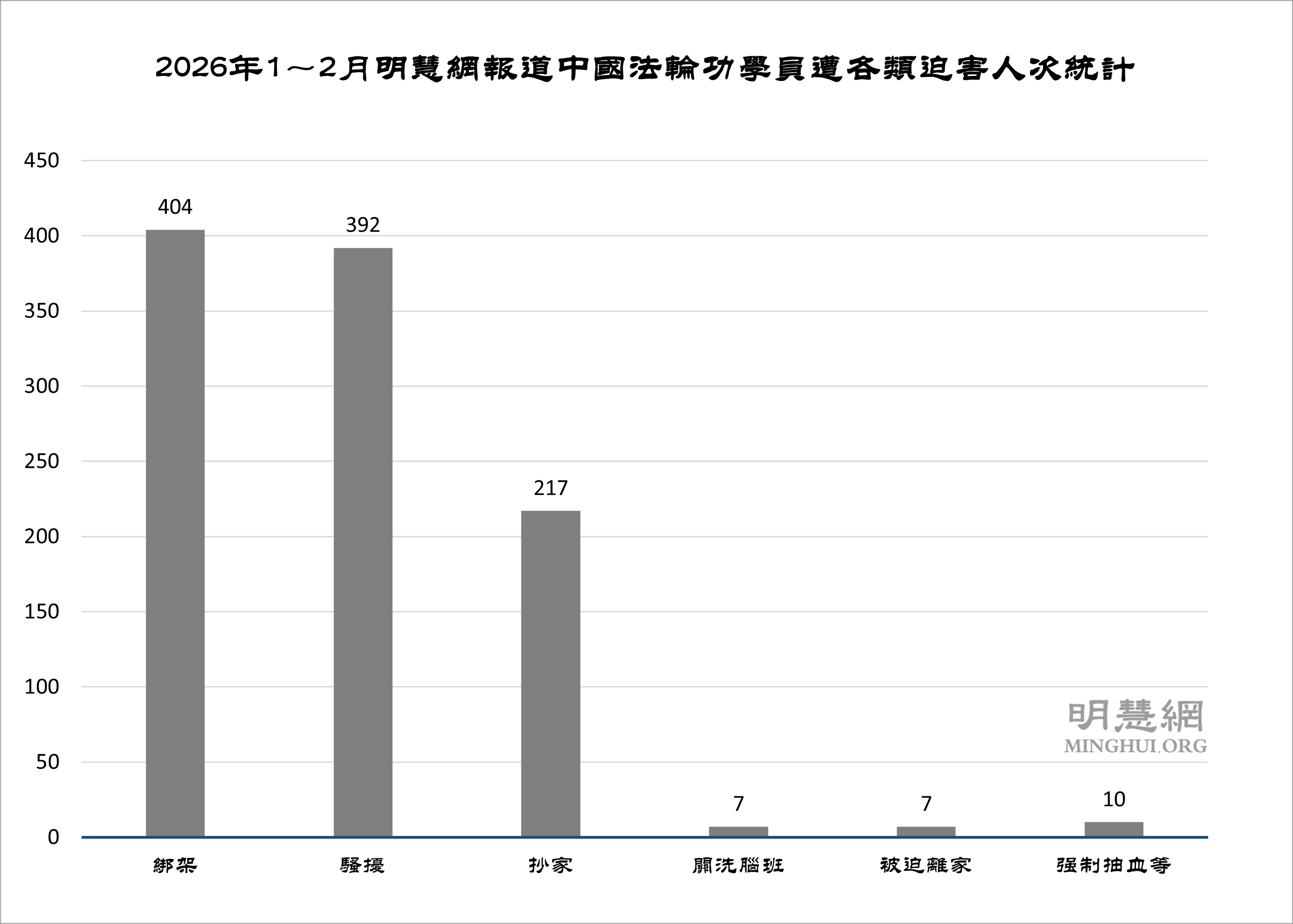 ![]() 圖1:2026年1~2月明慧網報導中國法輪功學員遭各類迫害人次統計 |