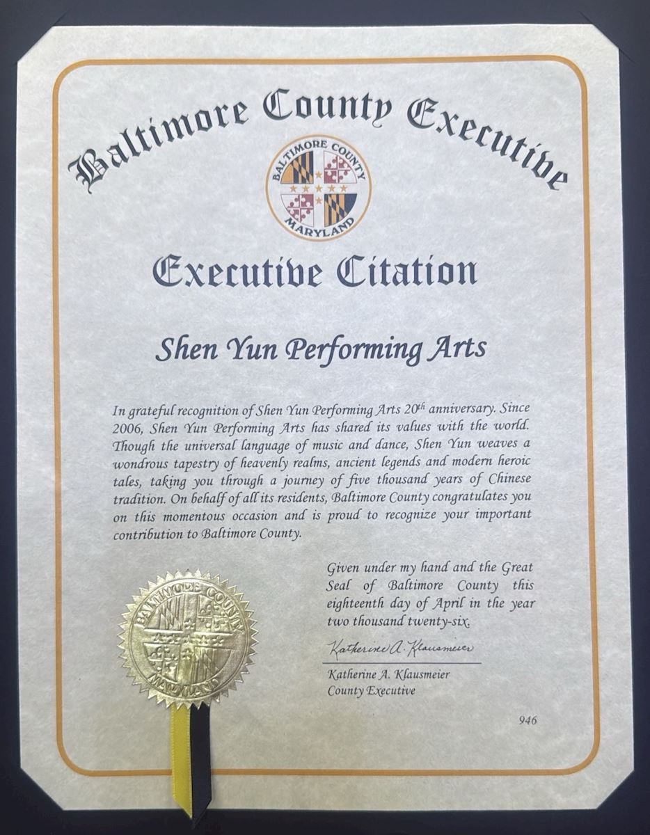 謹以此表達對神韻藝術團成立二十週年的誠摯嘉許。自2006年以來,神韻藝術團始終致力於向世界弘揚其所秉持的價值觀。通過音樂與舞蹈這一全人類共通的語言,神韻編織出一幅奇妙的畫卷,展現了天國勝境、古老傳說及現代英雄傳奇,引領觀眾踏上一段穿越五千年中華傳統文化的旅程。巴爾的摩縣謹代表全體居民,在這個具有里程碑意義的時刻,向你們致以祝賀;同時,表彰你們對巴爾的摩縣所作出的貢獻,我們為此感到榮幸。