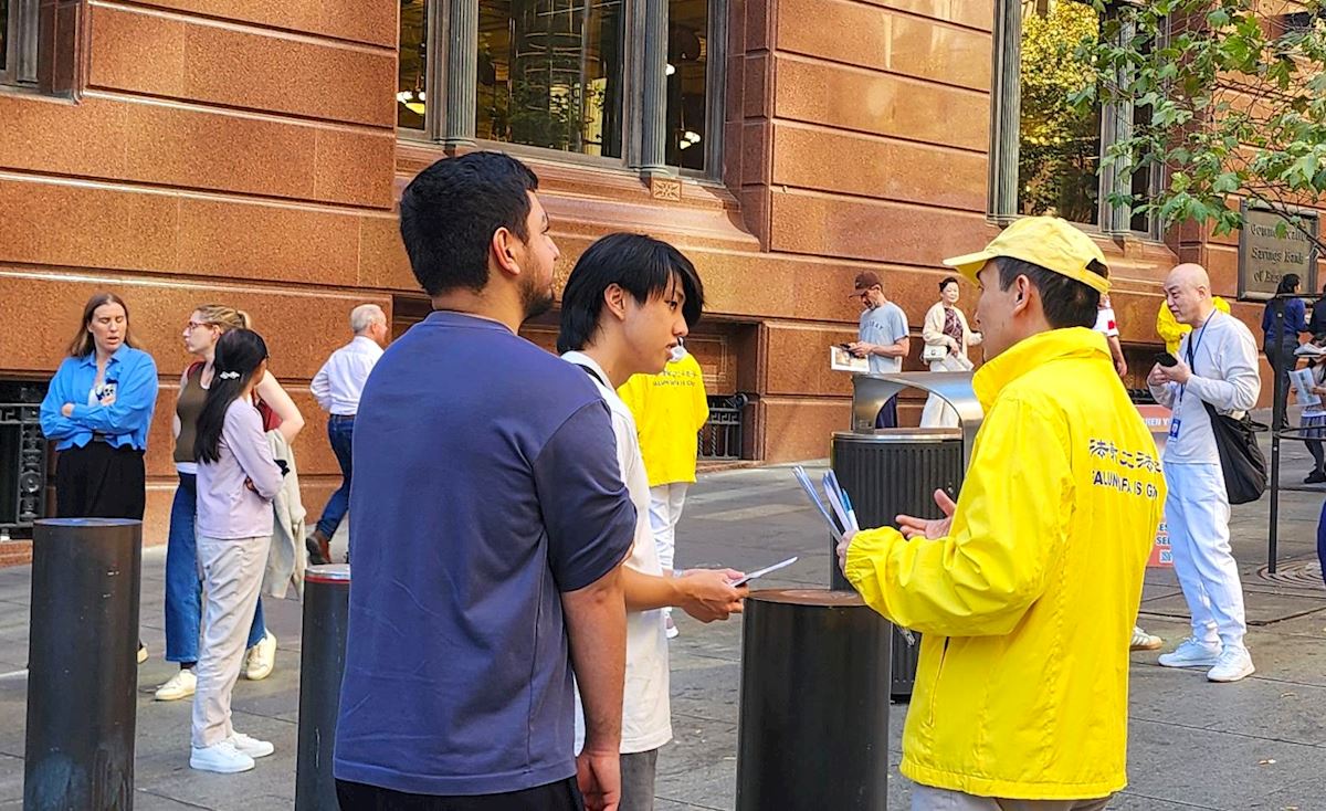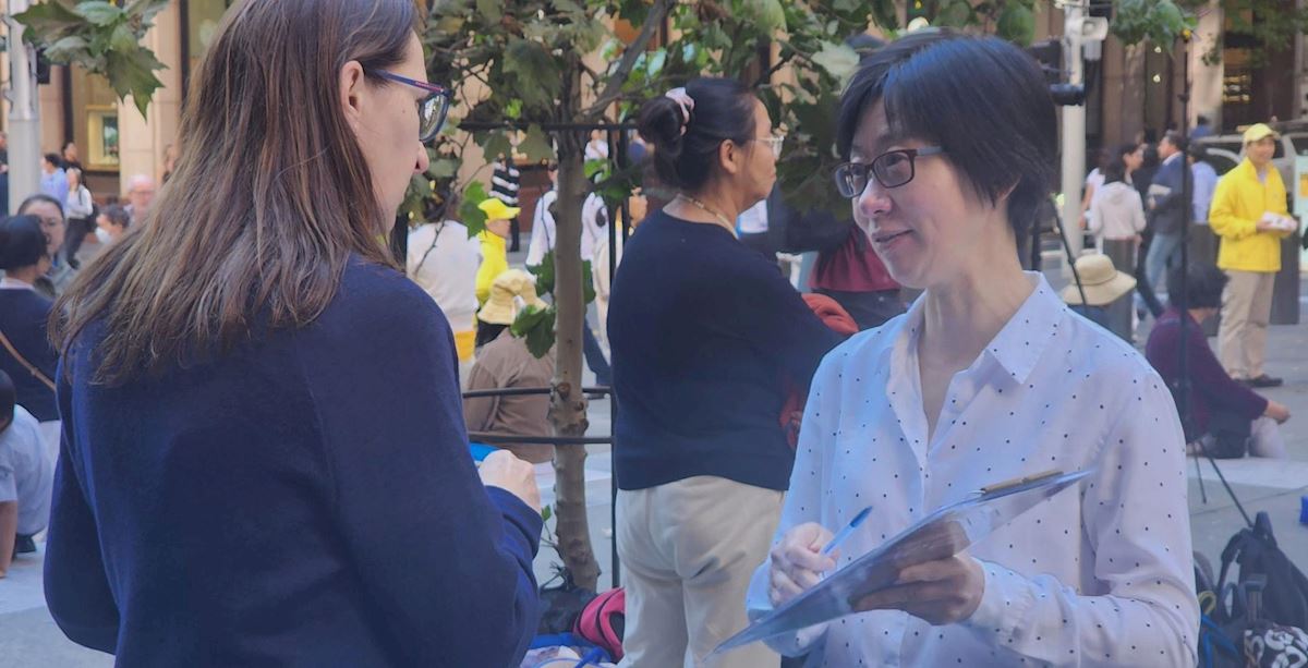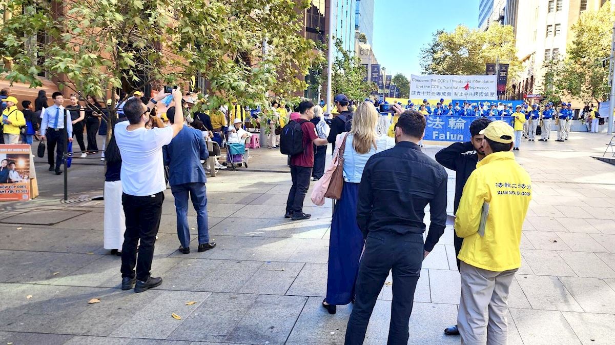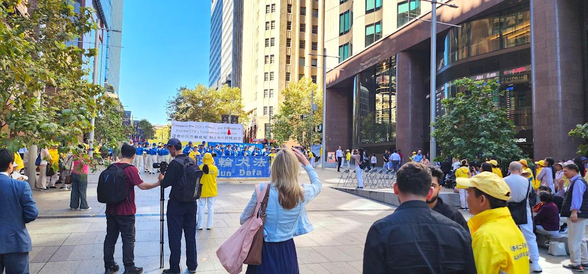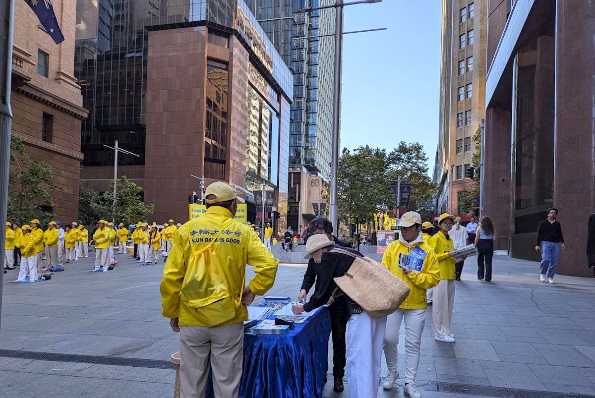 【明慧網二零二六年四月二十日】(明慧網澳洲悉尼記者站報導)二零二六年四月十六日,紀念「四‧二五」萬人上訪,揭露中共跨國鎮壓罪惡的大型集會,在澳洲悉尼金融商業中心馬丁廣場(Martin Place)舉行。悉尼法輪功學員在廣場上設立了信息服務台,為人們了解法輪功和神韻真相提供資訊,並向公眾徵集簽名。當天有數百名民眾簽名支持法輪功學員反迫害。人們表示,法輪功是一種和平的信仰,人們應該被允許按照自己的意願信奉自己的信仰。也有人表示,中共鎮壓法輪功是反人類的可怕行徑。(接前文