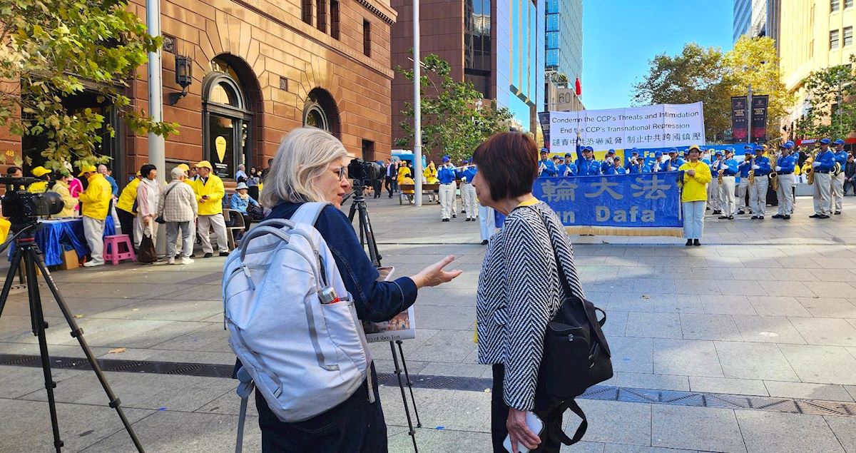 圖8:悉尼著名報社記者(左)向法輪功學員表示,她看到的集會場面祥和,認為信仰自由不應該被打壓,並期望了解更多真相。
